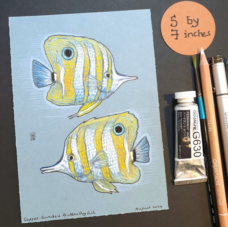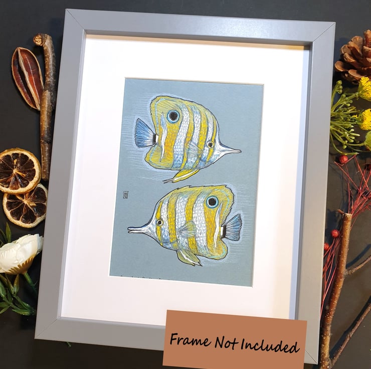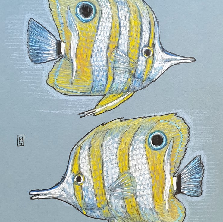 A colour drawing of two Copper-Banded Butterfly Fish. Yellow and white striped fish. The copper-banded butterflyfish, also known as the beaked coral fish, is found in reefs in both the Pacific and Indian Oceans.