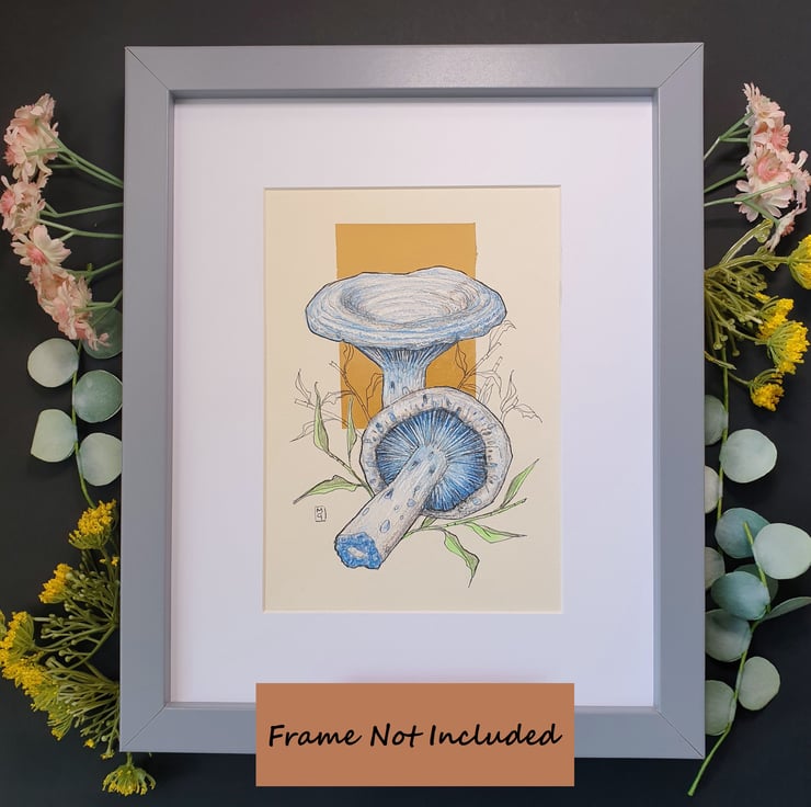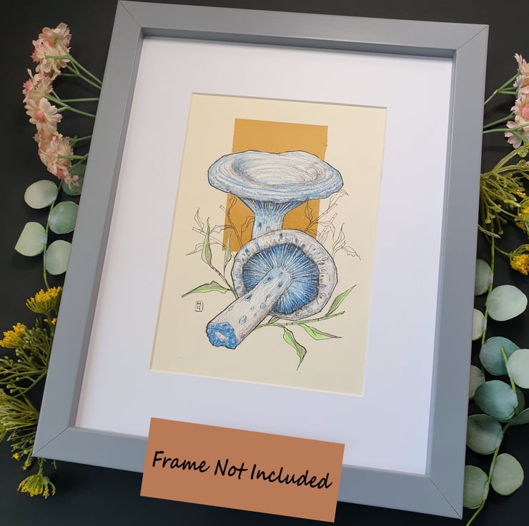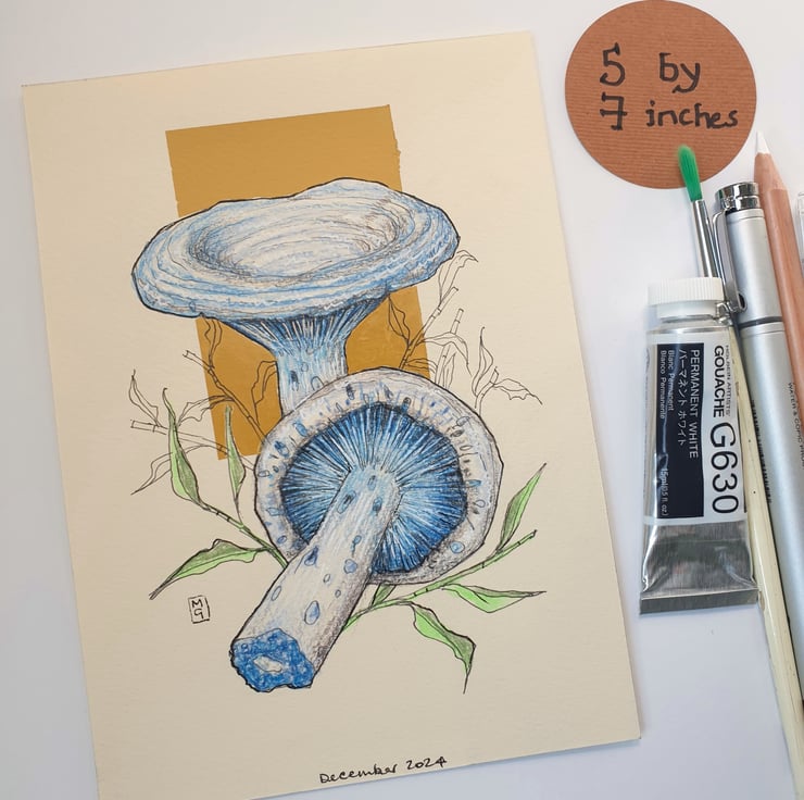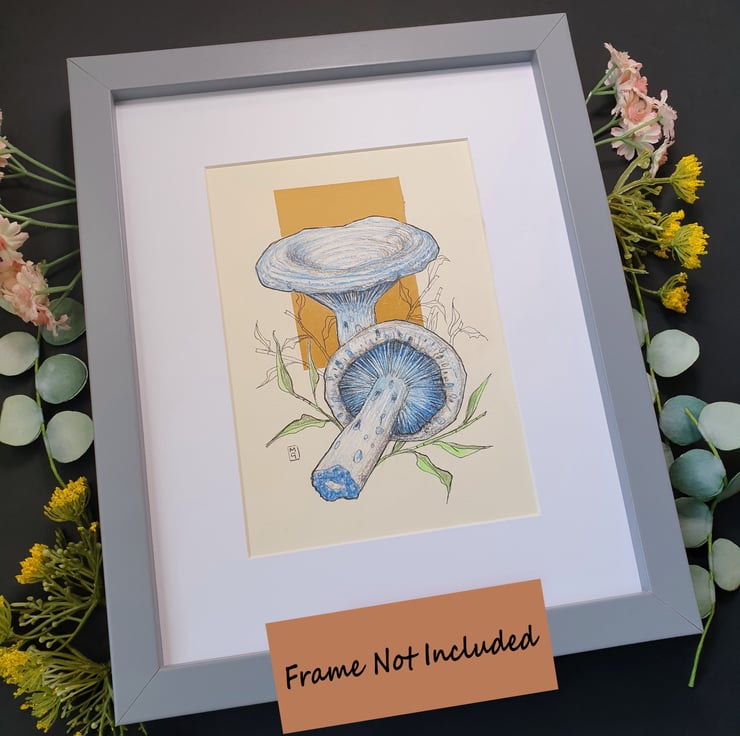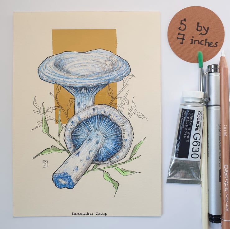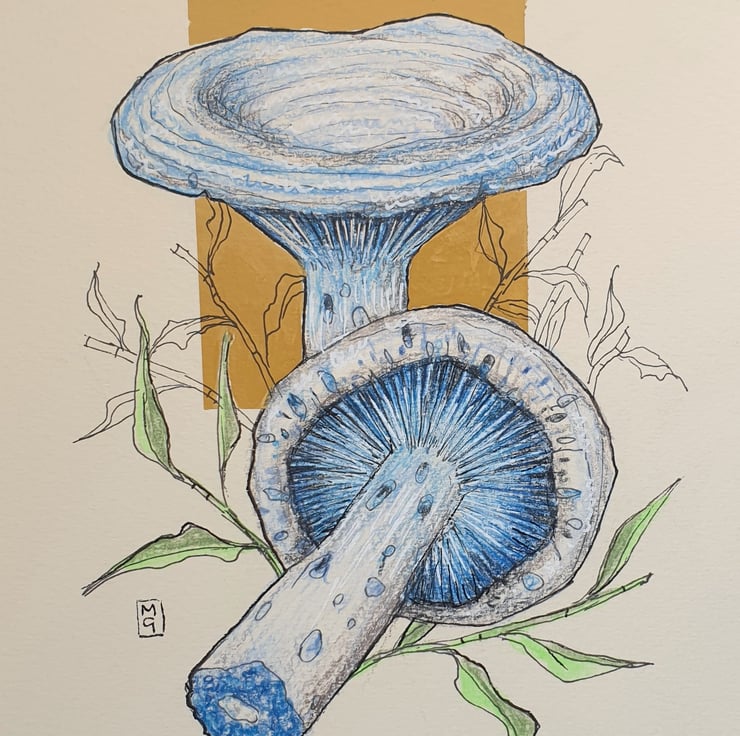 Indigo Milk Cap mushrooms drawing - Original mushroom wall art