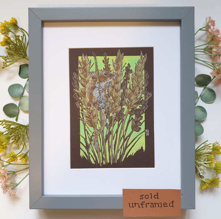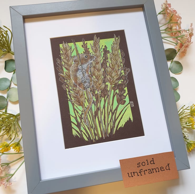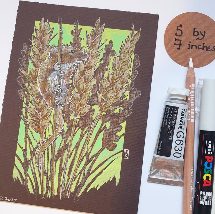A small drawing of a little harvest mouse climbing a wheat stalk, there is a background in green with more wheat behind the mouse. The drawing is on dark brown pastel paper.