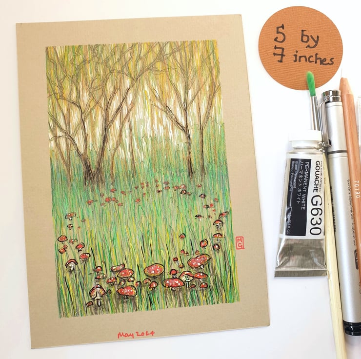 A colour drawing in mixed media of a woodland grove with a fairy ring of fly agaric mushrooms. A circle of fairy tale toadstools in red and white with fresh greens dominating the colour palette of the landscape.