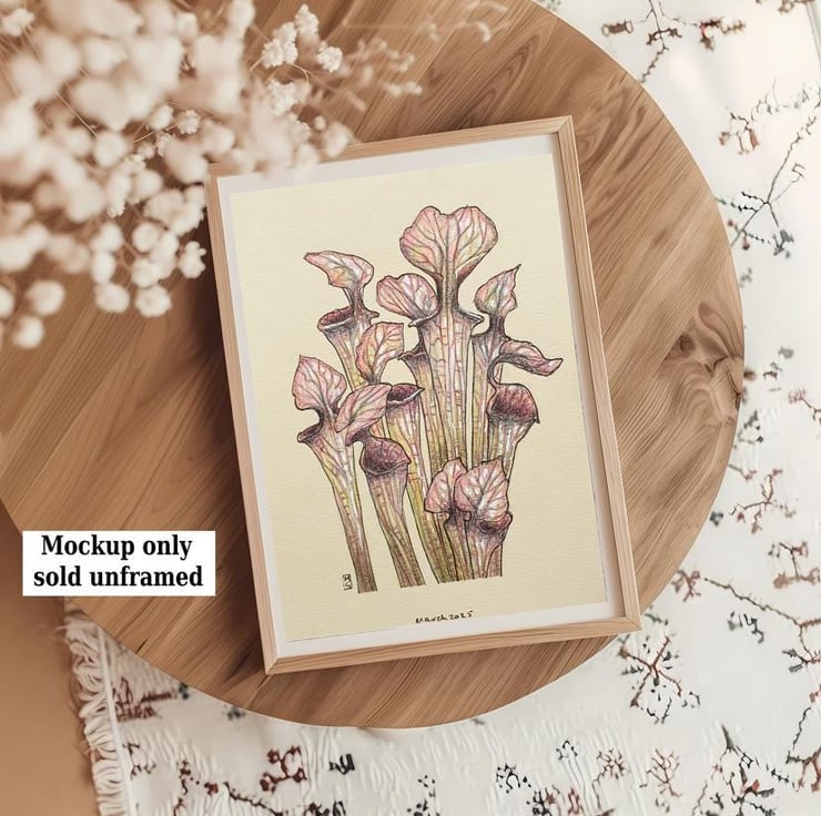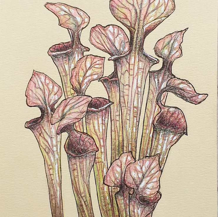 A small drawing of a group of carnivorous pitcher plants. The plants have pink and green tones. The drawing is on cream paper.