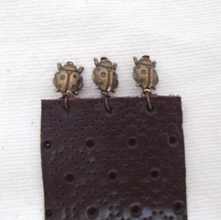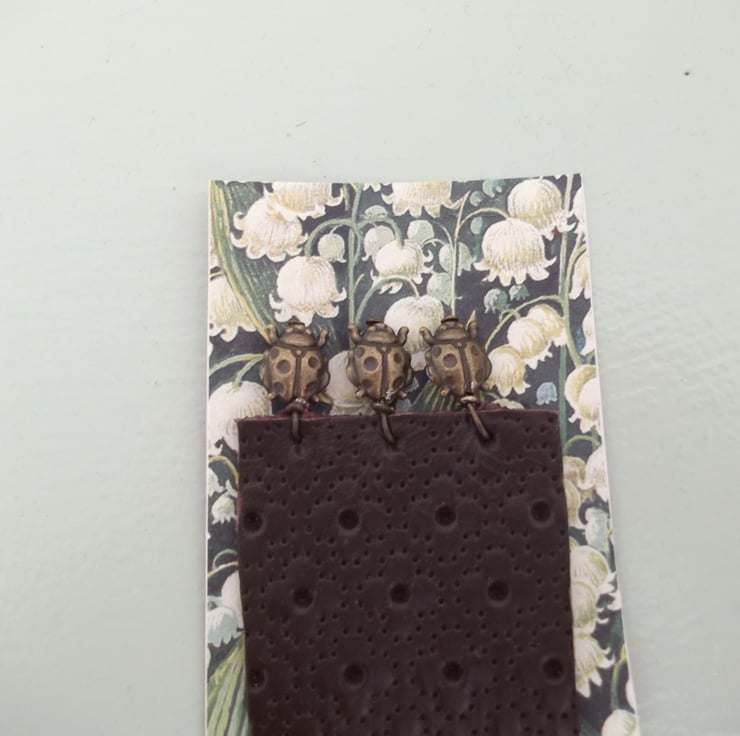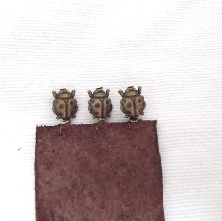 I had this loverly floral embossed dark brown leather and was making lots of different things. I thought it would make great bookmarks but wanted to zhuzh it up. I had some of these small ladybird beads and thought they would look great for a nature inspired bookmark.