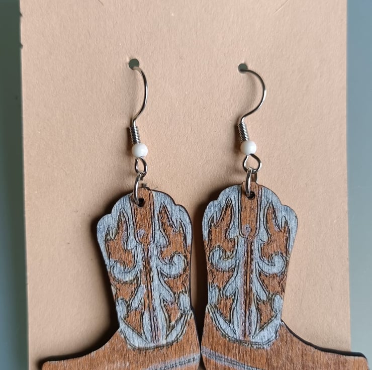 Each earring features a stylized cowboy boot design crafted from laser-cut, light-coloured wood, The wood has been painted a reddish-orange hue, resembling a terracotta or muted coral colour.
