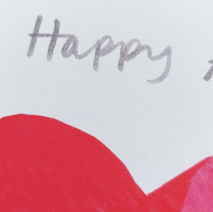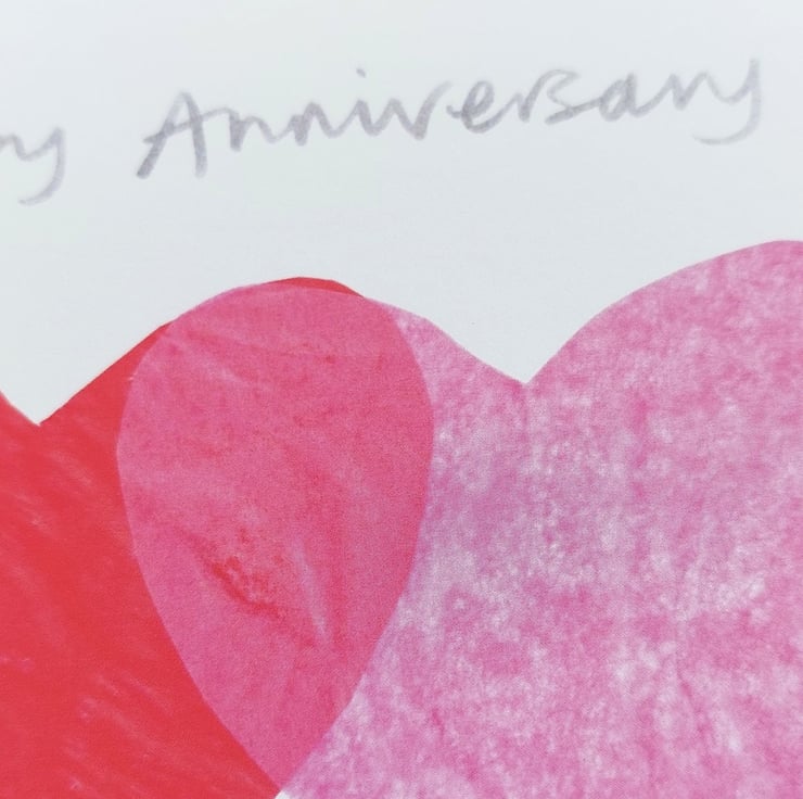 This happy anniversary card shows two overlapping red and pink hearts on a crisp white background. The words 'Happy Anniversary' are written in grey. My design, which has hand cut tissue paper hearts and hand lettering, was scanned and reproduced digitally.