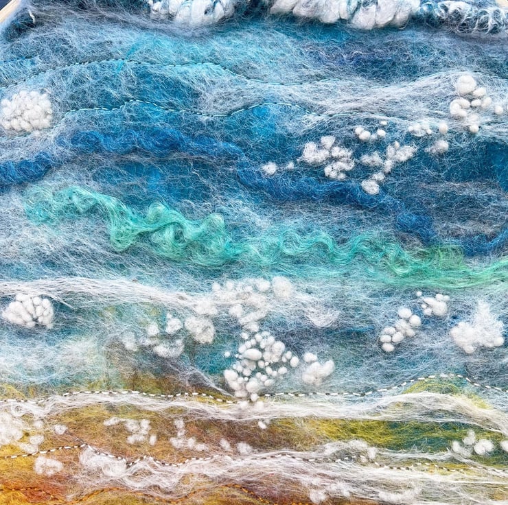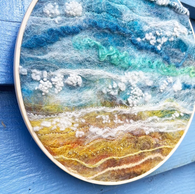 Sand and Sea Wet Felted and Needle Felted Picture with Hand Embroidery.