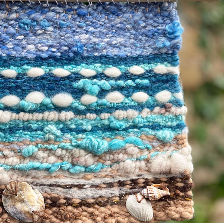 Sennen Beach woven wall hanging inspired by my favourite beach here in West Cornwall where I live. The weaving has been hand woven on my frame loom using my own handspun art yarns and wool roving and features hand embroidery and Cornish sea shells.