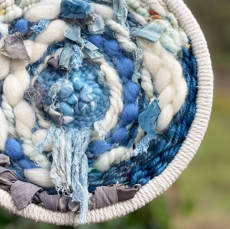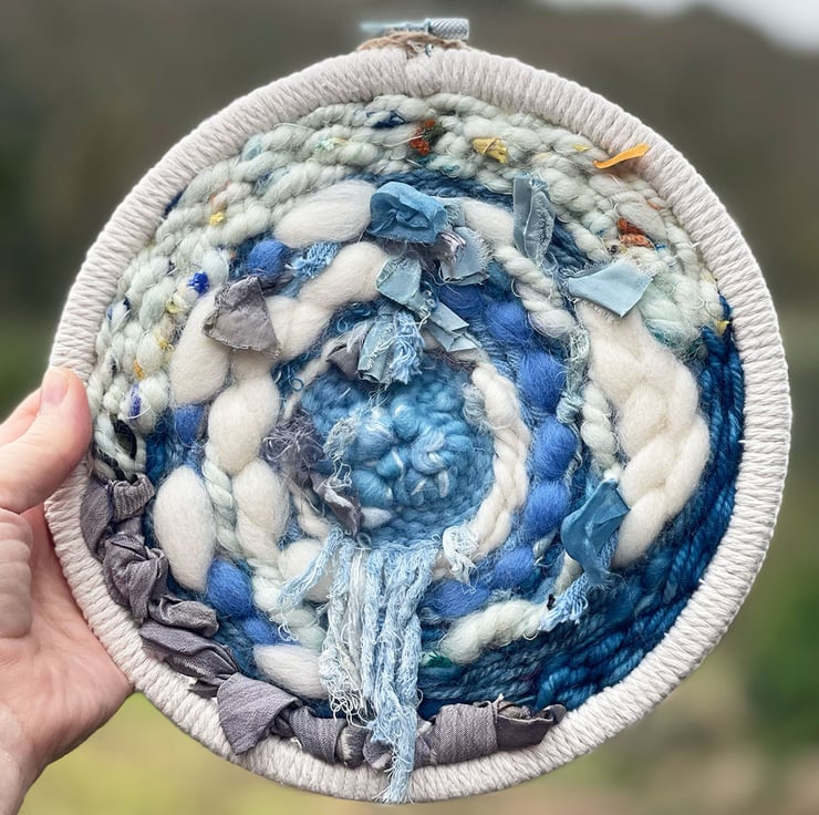Unique Wild Sea circular hand woven artwork framed in a wooden embroidery hoop which has been bound with white macrame cotton. The artwork is a one of a kind piece which I have hand woven with my own hand dyed and handspun art yarns, indigo dyed handspun yarns, wool roving, cotton gauze, and sari ribbon.