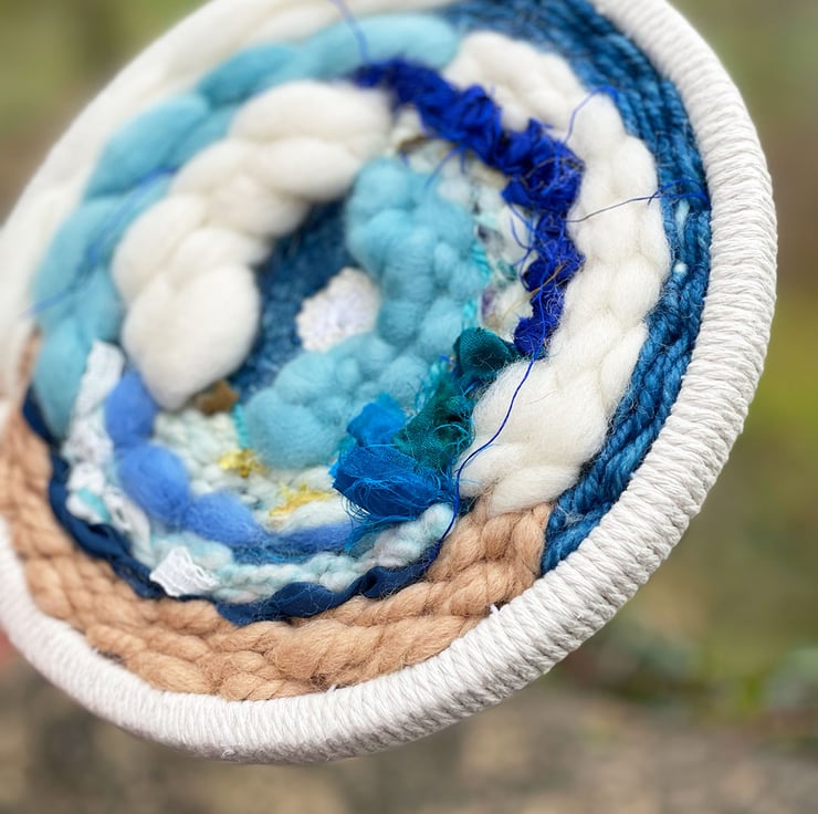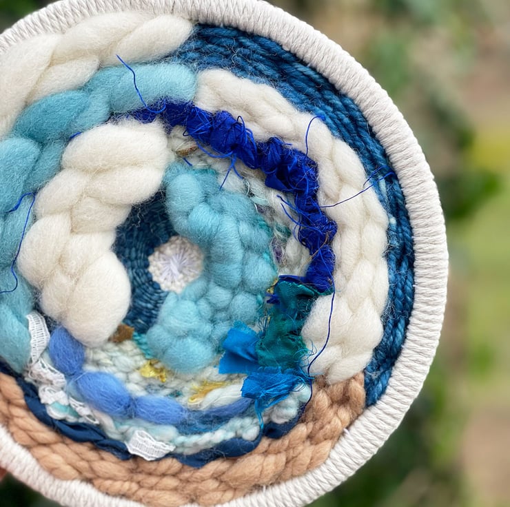 Unique Ocean Waves circular hand woven artwork framed in a wooden embroidery hoop which has been bound with white macrame cotton. The artwork is a one of a kind piece which I have hand woven with my own hand dyed and handspun art yarns, roving and sari ribbon.