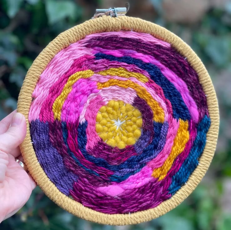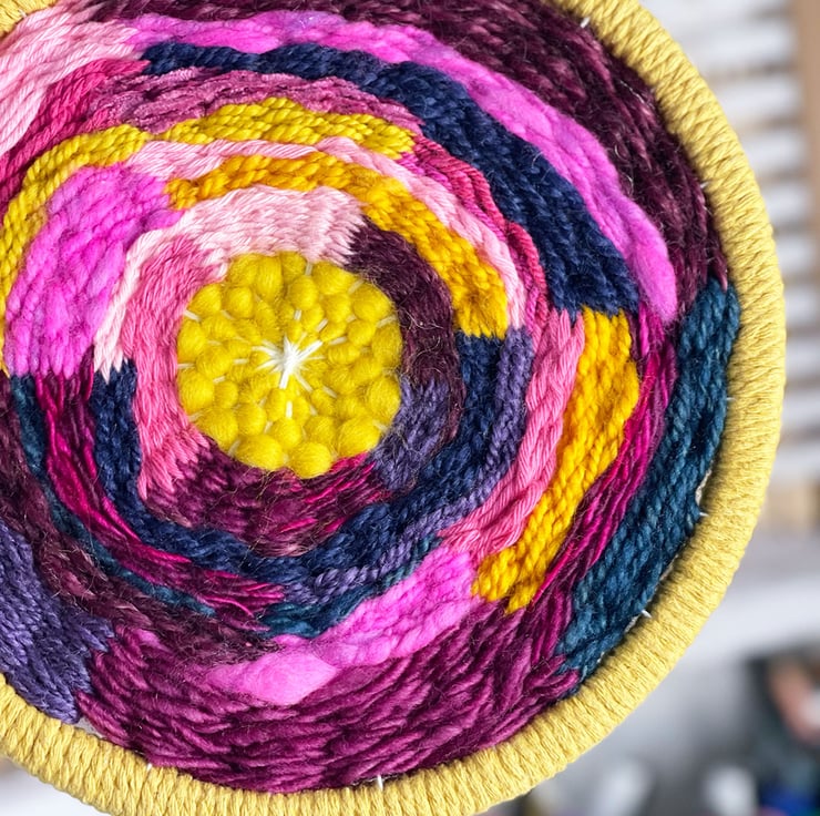 Unique Cornish Sunset inspired circular hand woven artwork framed in a wooden embroidery hoop which has been bound with yellow macrame cotton. The artwork is a one of a kind piece which I have hand woven with my own hand dyed and handspun yarns.