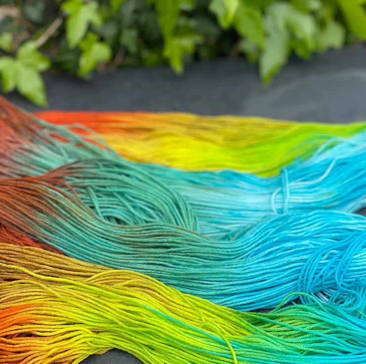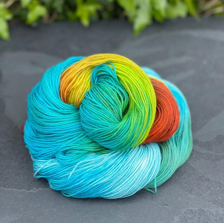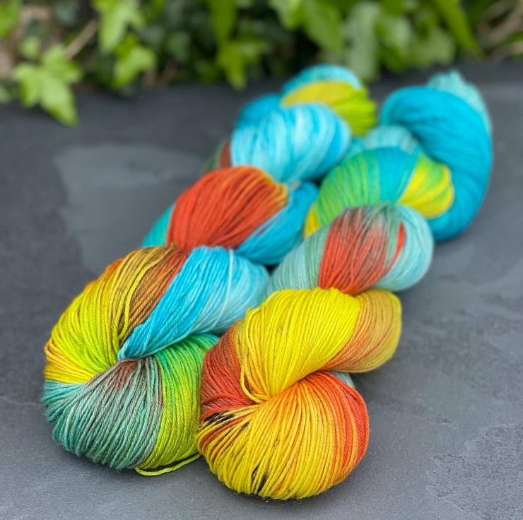 Hand dyed in small batches with professional acid dyes there maybe slight variations between skeins. If using multiple skeins in a project I recommend that you change between skeins to get an even colour distribution.