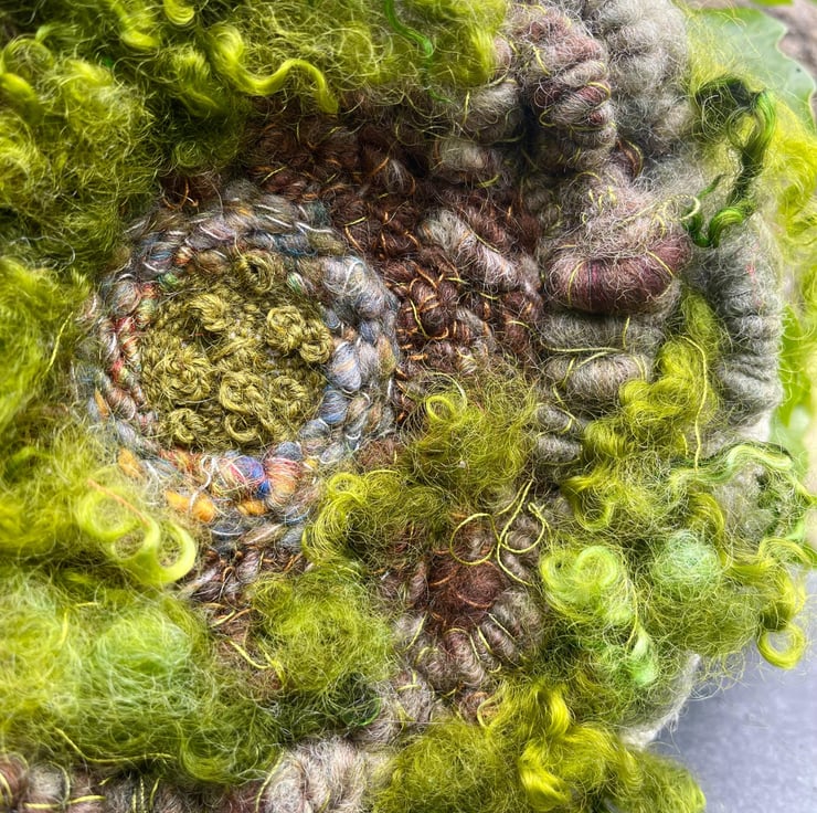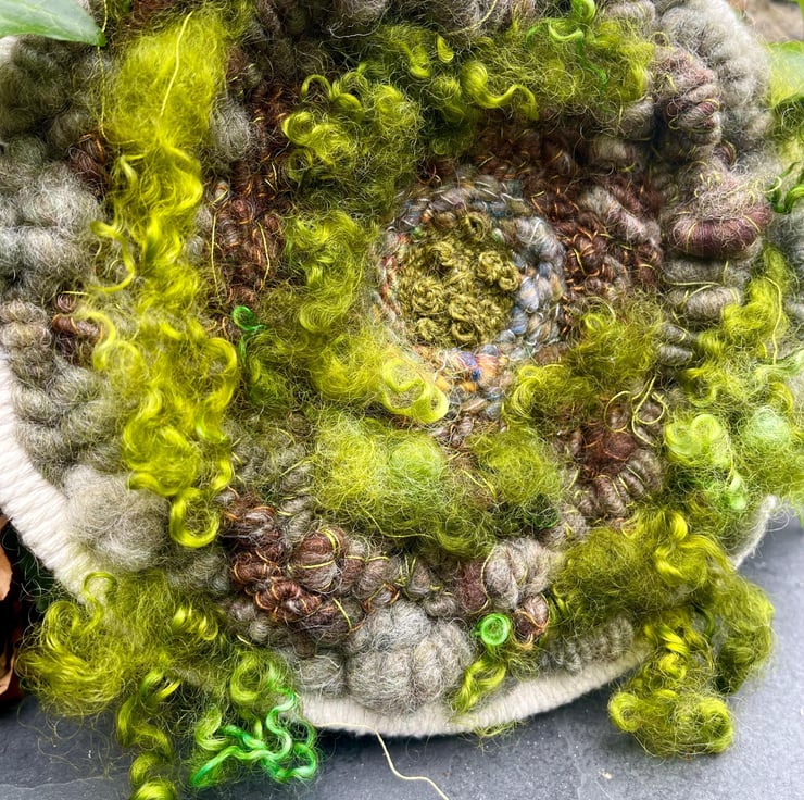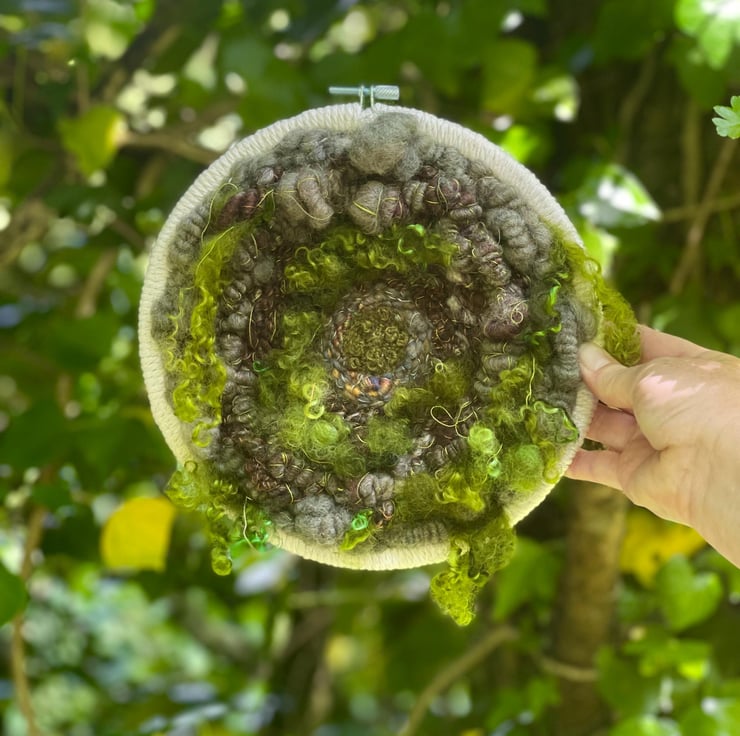 Unique Moss inspired woven artwork framed in a wooden embroidery hoop which has been bound with white macrame cotton. The artwork is a one of a kind piece which I have hand woven with my own hand dyed and handspun art yarns and hand dyed wool locks.