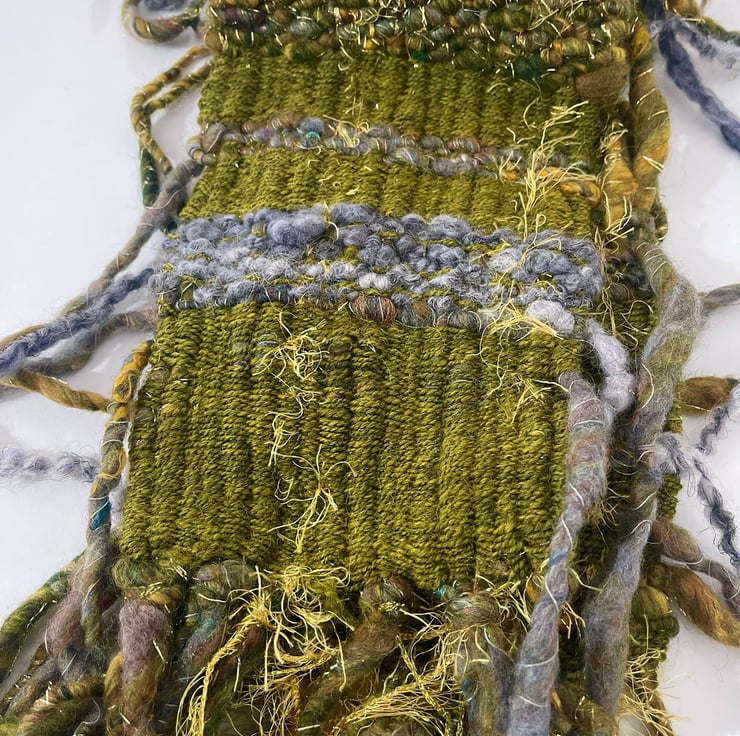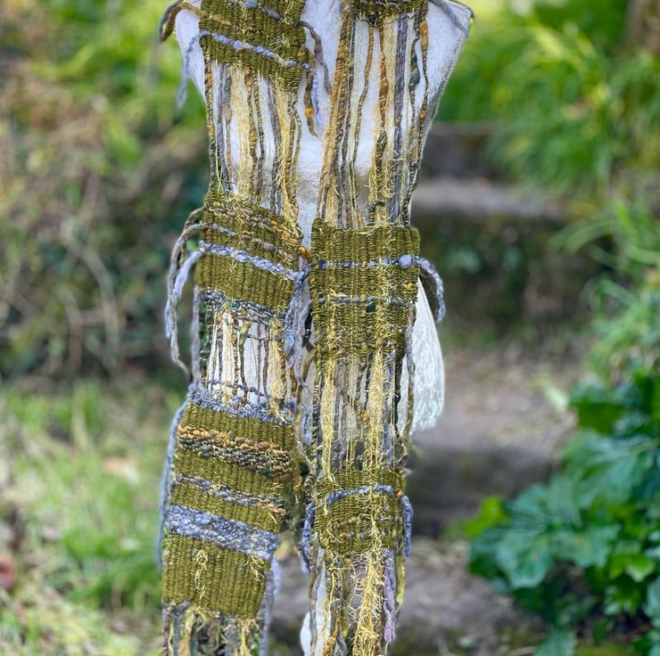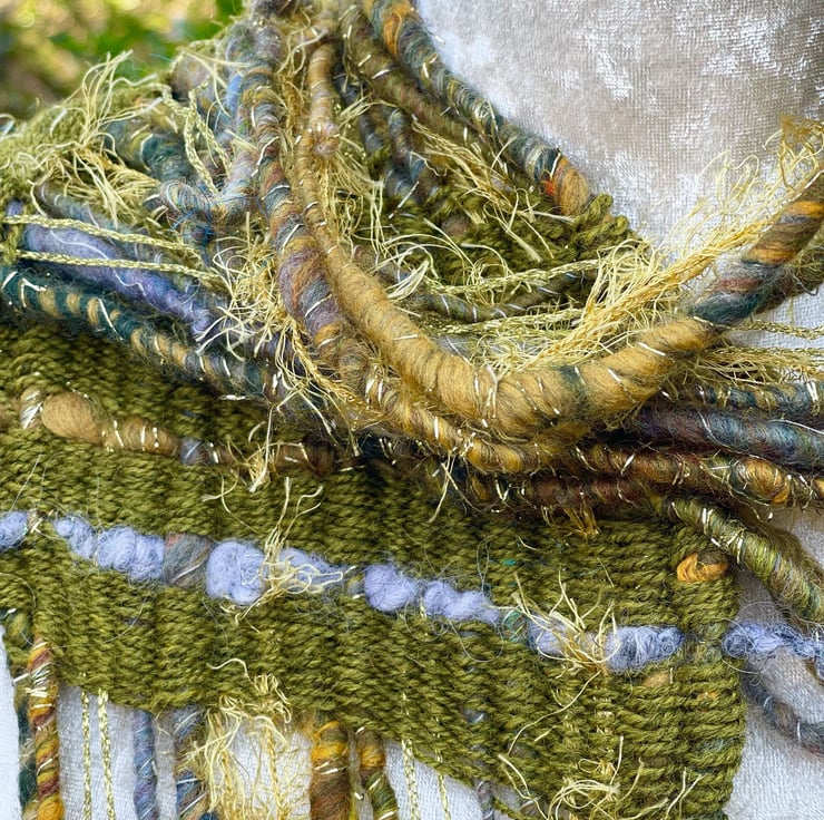 The scarf was woven on my Ashford Rigid Heddle Loom in a crammed and spaced weaving technique to highlight the corespun art yarns that are used in the warp. The weft is a handspun 2 ply blend of Corriedale and Polwarth wool. The scarf has been finished with a simple knotted fringe.