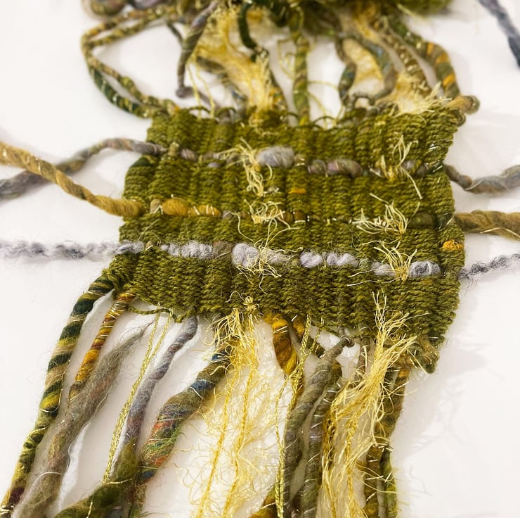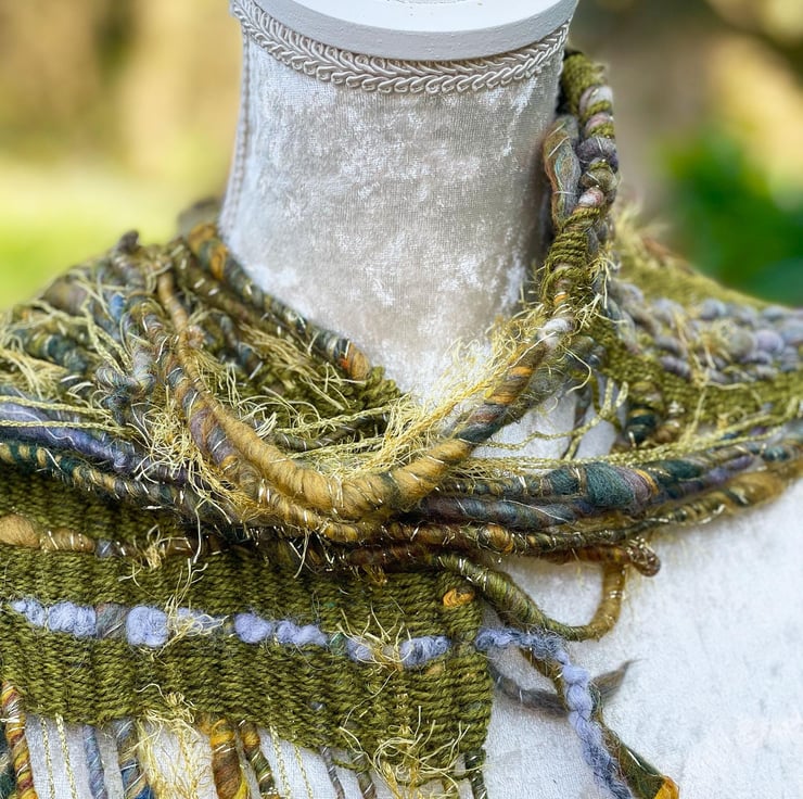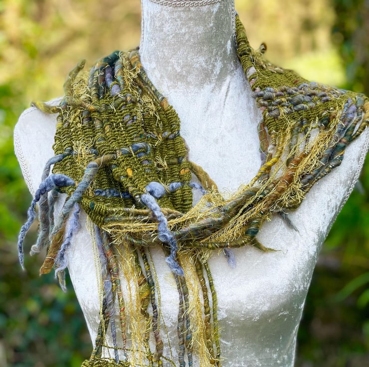 This beautiful one-of-a-kind textured hand woven scarf has been woven from mixed fibre handspun art yarns which includes merino wool, alpaca, wool locks, sari silk ribbon, gold eyelash yarn and Angelina fibre in tones of brown, olive green, grey and gold.