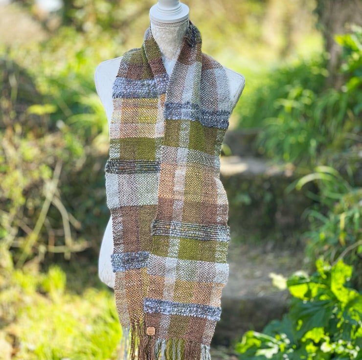 This beautiful hand woven woodland inspired scarf is woven from handspun yarns and art yarns in shades of brown, green, rust and grey. The yarns are hand dyed Corriedale and natural grey Gotland wool.