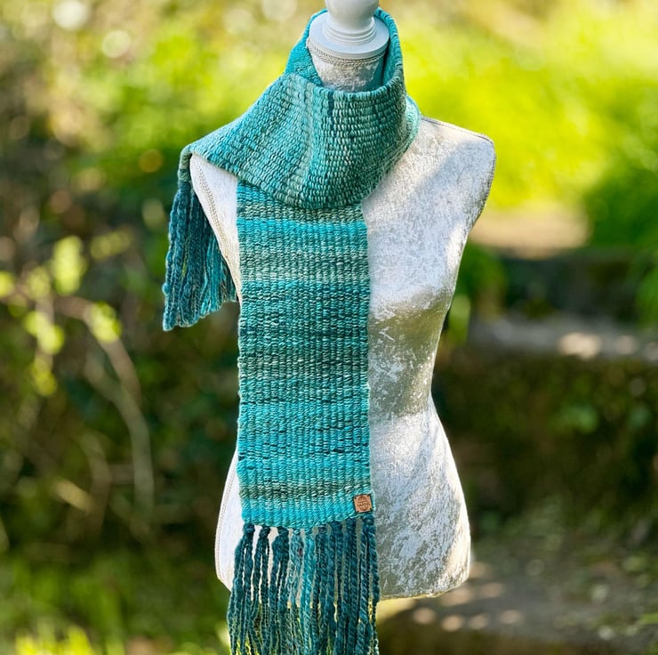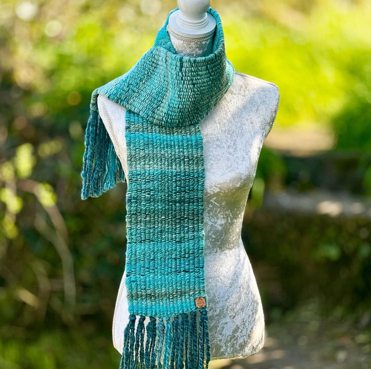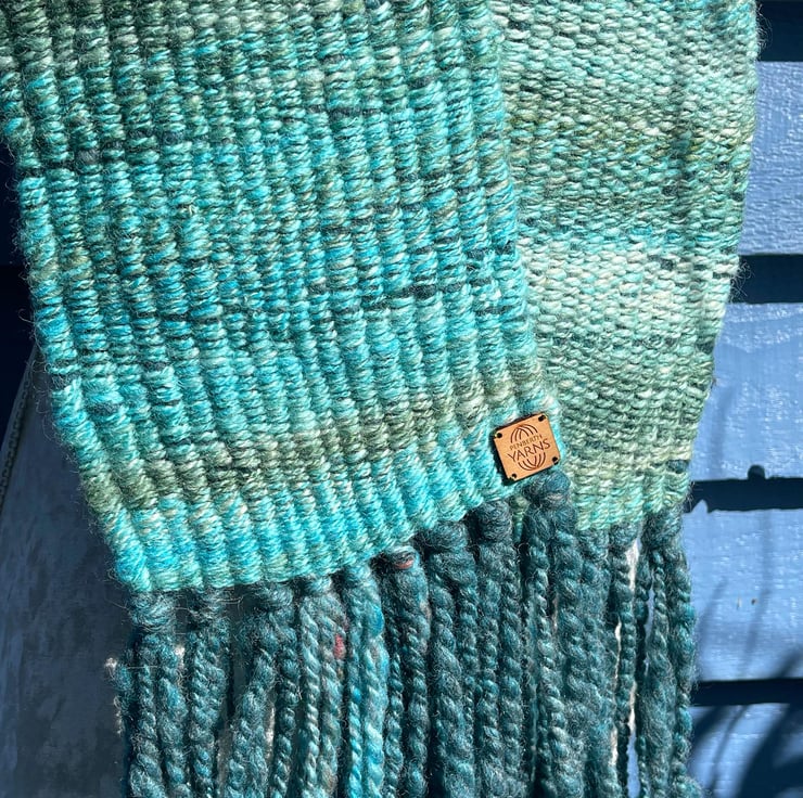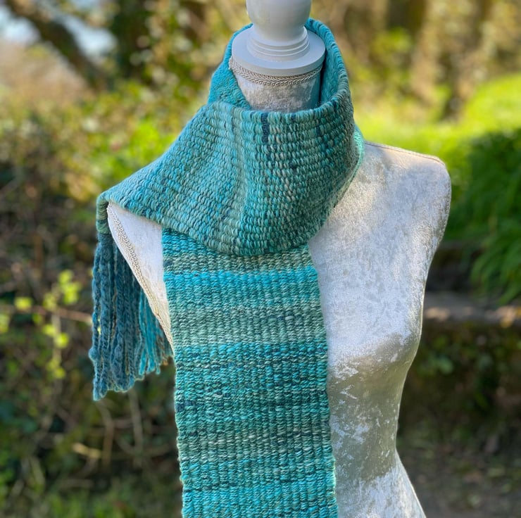 This beautiful hand woven scarf is woven from hand dyed and hand blended hand spun Corriedale wool, Blueface Leicester and Merino wool.
