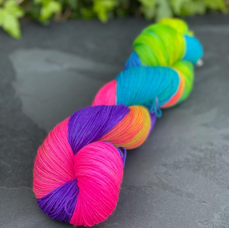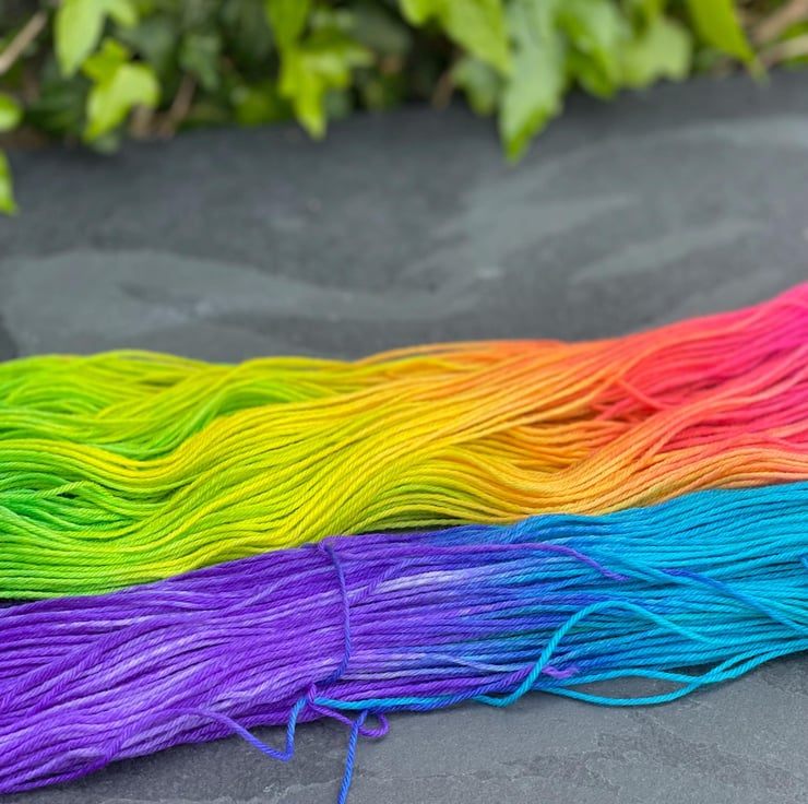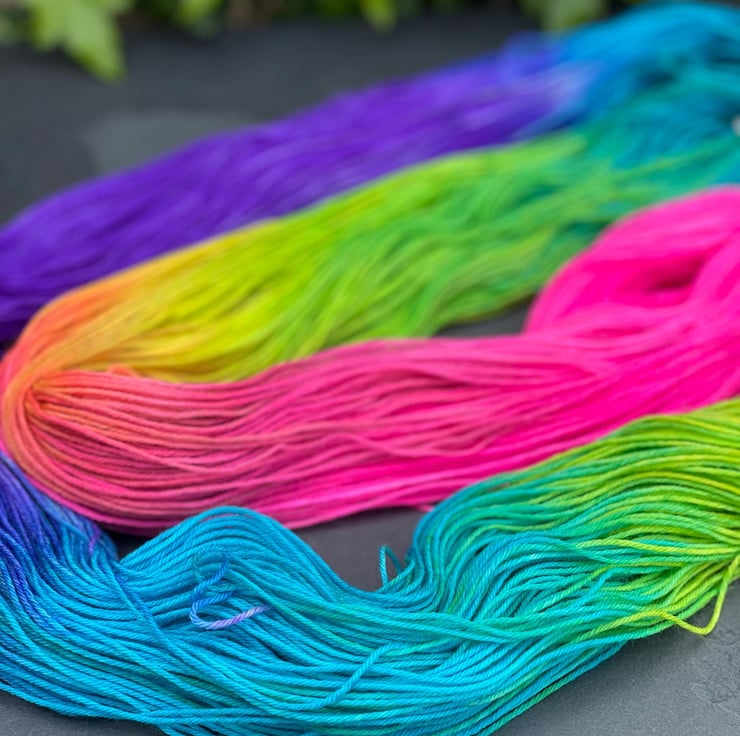 Hand dyed in small batches with professional acid dyes there maybe slight variations between skeins. If using multiple skeins in a project I recommend that you change between skeins to get an even colour distribution.