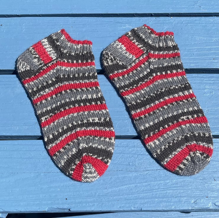 Beautiful woolly hand knitted shortie socks made from 4ply wool / nylon self striping yarn. Perfect for wearing with trainers or sandals!