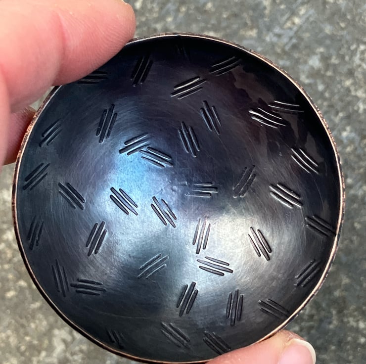 These tiny copper bowls are hand stamped and hammered, then formed from flat sheet into a bowl form. The bowl is then oxidised and rubbed back to highlight the pattern.