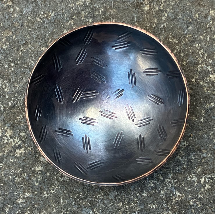 Oxidised copper bowl with stamped line pattern, 7th wedding anniversary gift