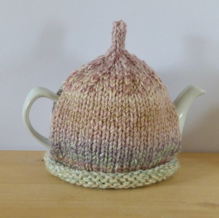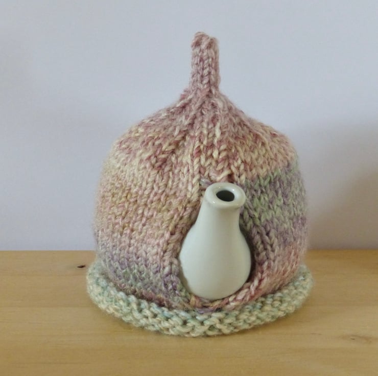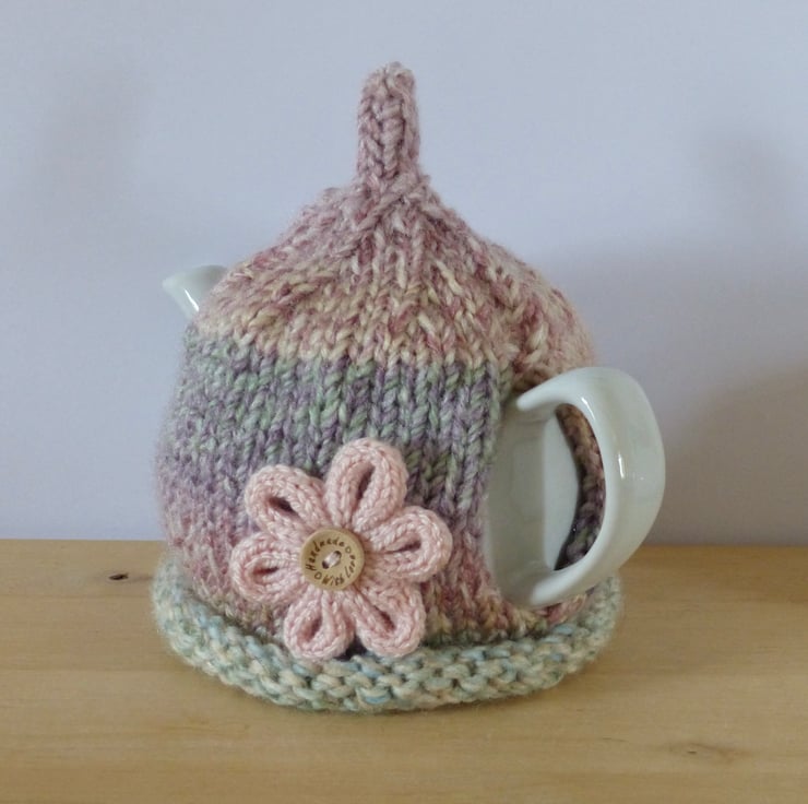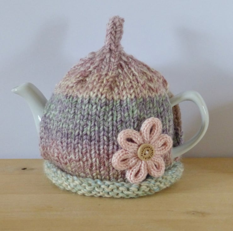A hand knitted Tea Cosy in a chunky variegated yarn in pastel shades including Pink, Purples, and Green. It has a 'pixie' top and a french knitted flower in a co-ordinating pink yarn on the front for decoration. This flower has a natural wood button in the centre with the words 'Handmade With Love' on it.