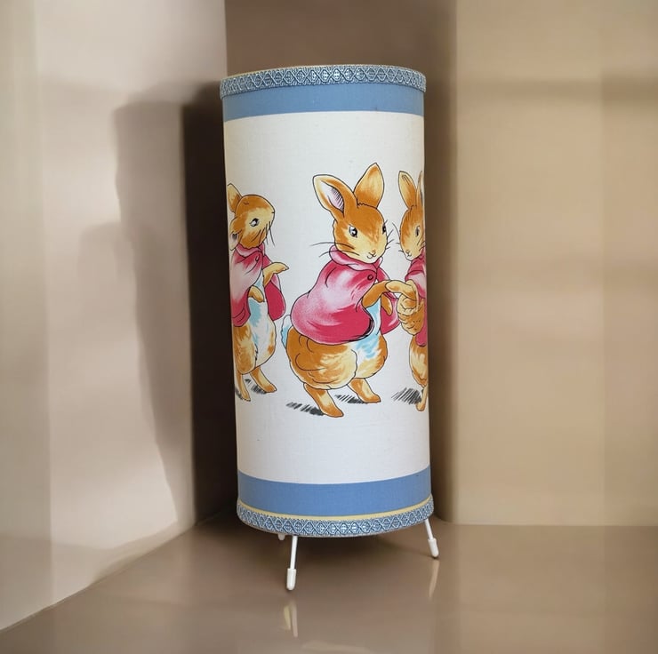 This handmade table lamp features an adorable vintage bunny in rosy pink jacket, perfect for adding a nostalgic storybook feel to any room. With soft blue borders and delicate trim, it has timeless charm that makes it ideal for a nursery, childs room or anyone who loves classic character design.