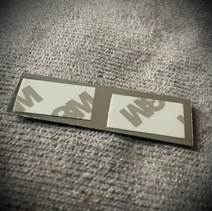 Taped with 3M double sided tape. The space in between the tape creates and air pocket so the tape stays secure to the item. The high quality 3M tape will stick to most surfaces. We always advise cleaning the surface of the item before applying the plate.
