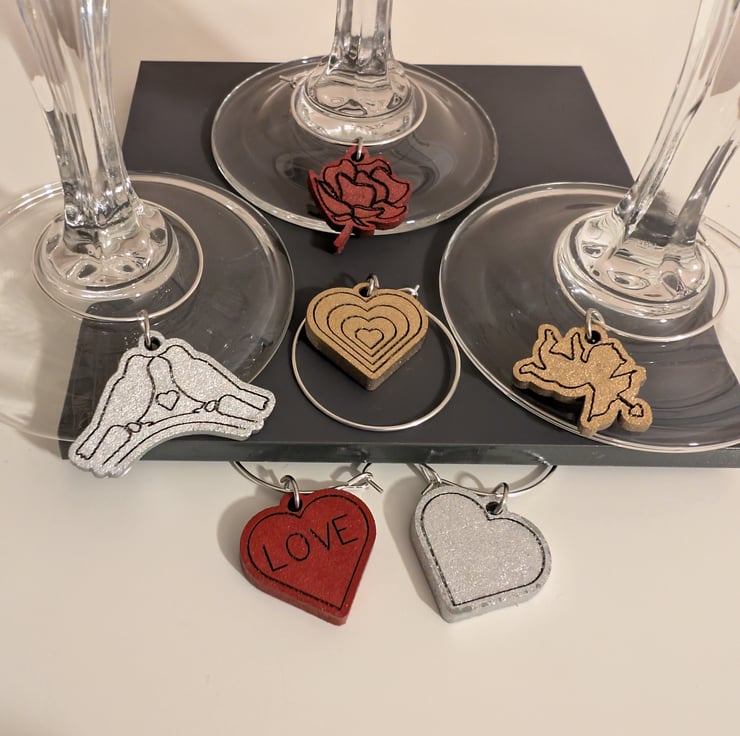 Add a thoughtful detail to any celebration with this set of six laser cut and spray painted glass charms, designed to make gatherings more personal, colourful, and fun. Each charm in the set features a unique design based on Love - perfect for helping guests keep track of their drinks while adding a touch of charm to your table.
