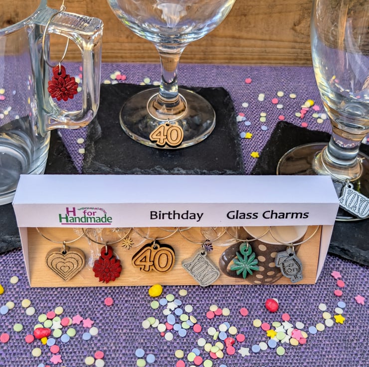 Add a thoughtful detail to any celebration with this set of six laser cut and spray painted glass charms, designed to make gatherings more personal, colourful, and fun. Each charm in the set features a unique design based on celebration - perfect for helping guests keep track of their drinks while adding a touch of charm to your table.