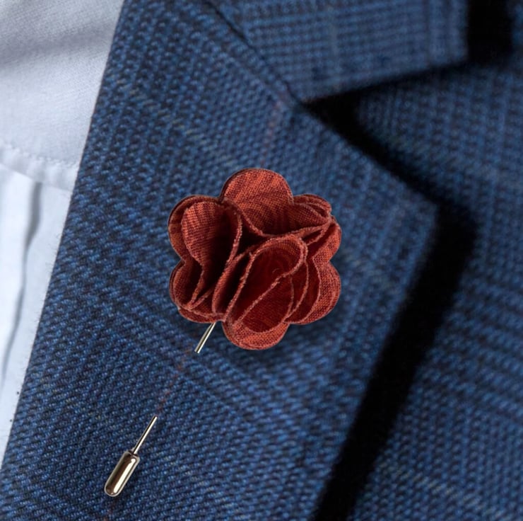 Add a subtle yet stylish finishing touch to your outfit with this handcrafted fabric flower lapel pin. Carefully sewn by hand using deep orange and red fabric, this elegant accessory is the perfect finishing touch for weddings, parties or simply elevating your everyday suit.