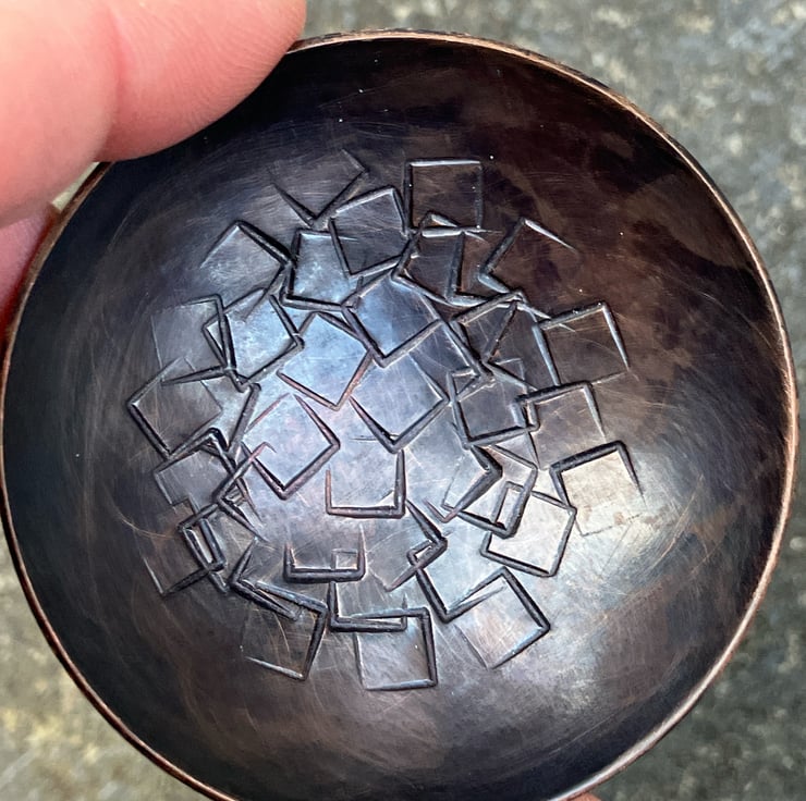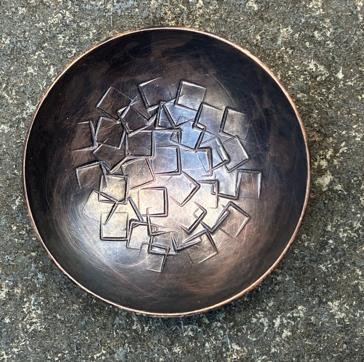 These tiny copper bowls are hand stamped and hammered, then formed from flat sheet into a bowl form. The bowl is then oxidised and rubbed back to highlight the pattern.