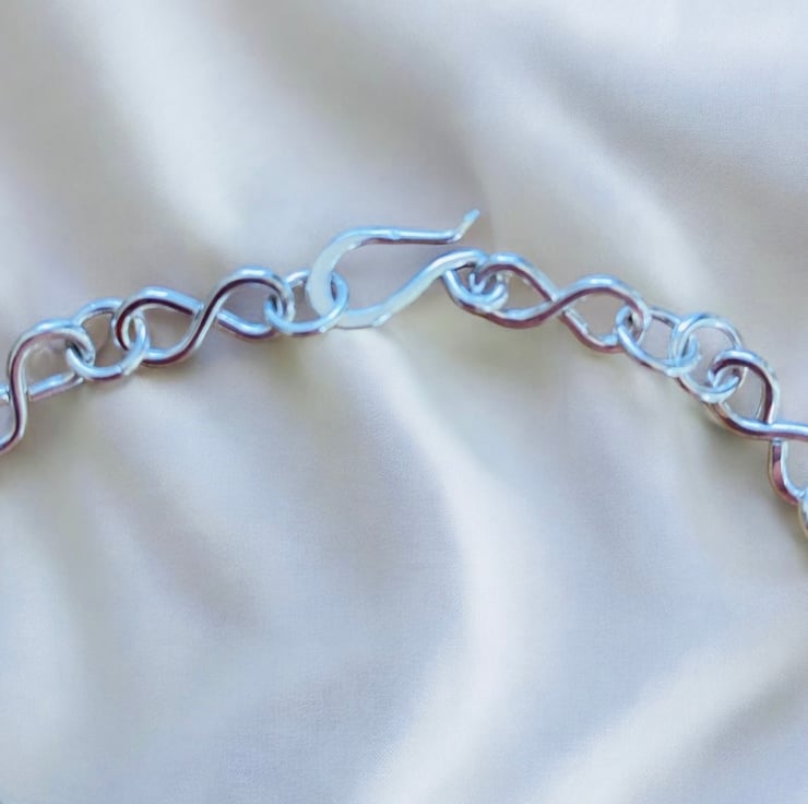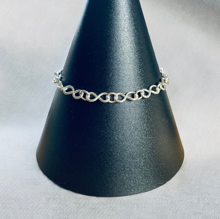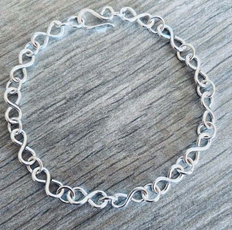 A simple but elegant sterling silver bracelet. This bracelet is made from sterling silver wire shaped into figure 8 links and finished with a handmade hook clasp.
