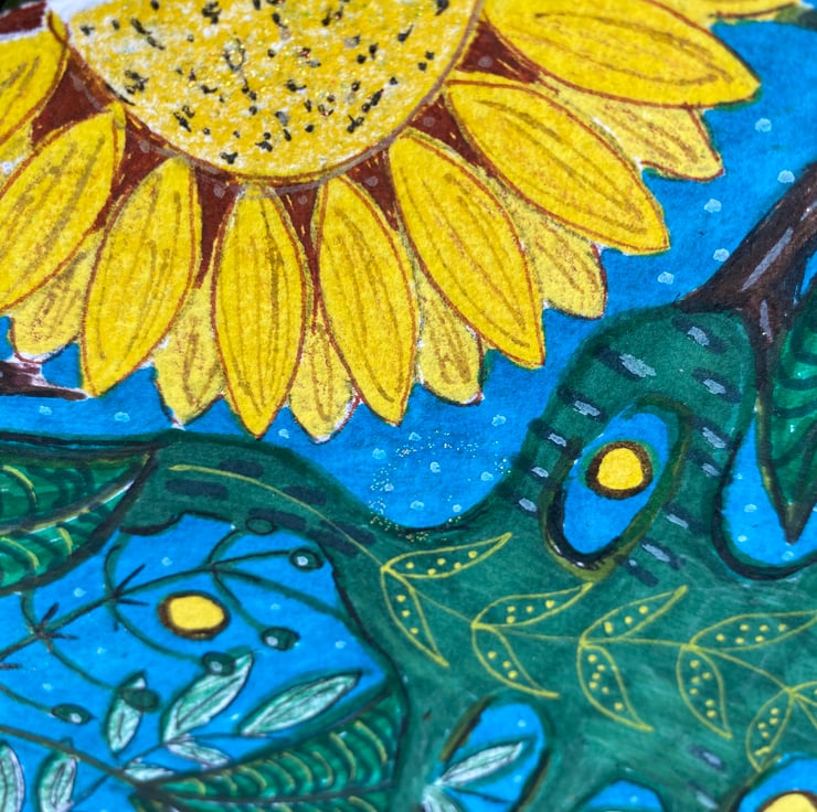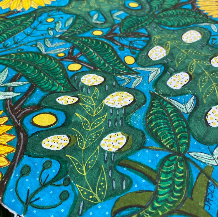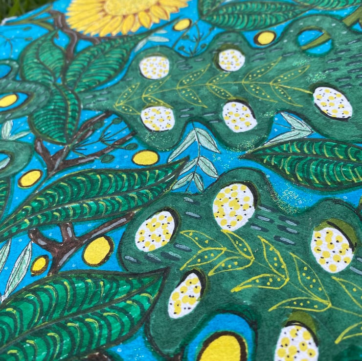 Original Abstract Nature drawing of Yellow Flowers in Nature, hand drawn onto Khadi paper using various pens.