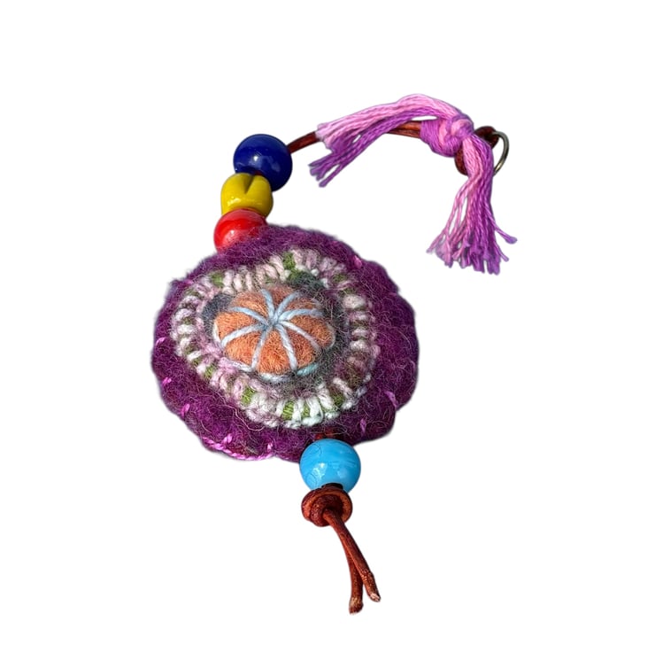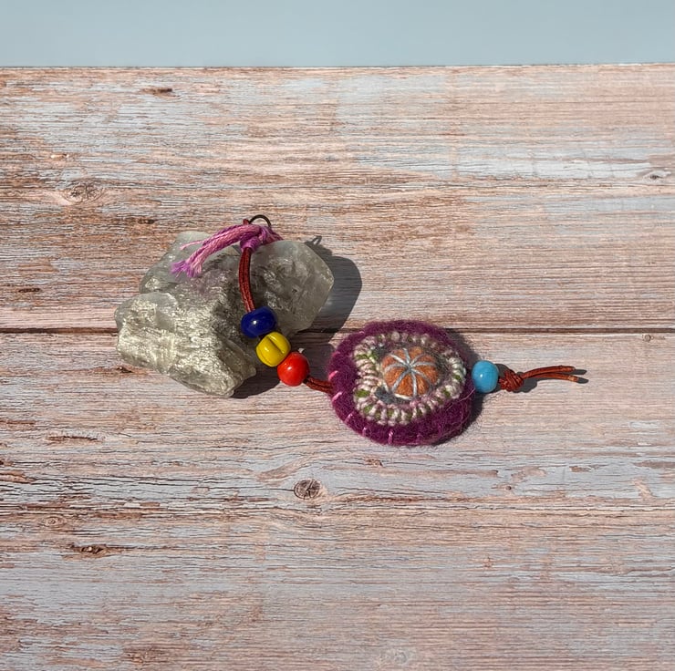 This pocket sized beaded charm is designed as a pretty, tactile, stress relief aid with colourful glass beads and a soft felted disc strung on a leather thong attached to a metal ring.