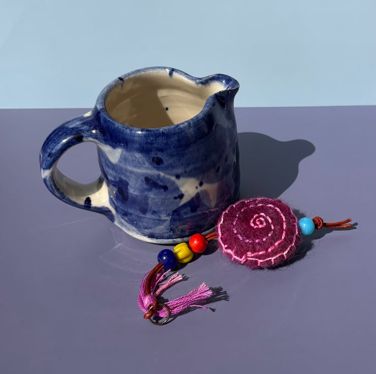 I have created the disc by needle felting wool fibre and yarn into a plain motif. I then use yarn and embroidery to add colour, pattern and detail.