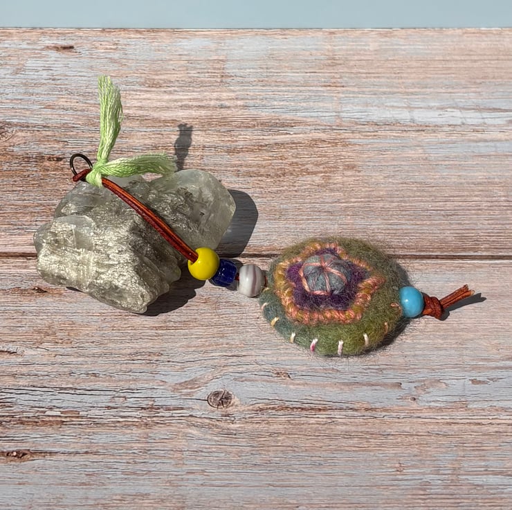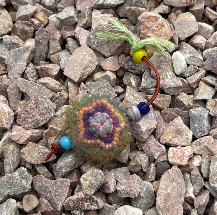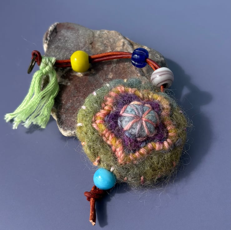 Three of the four glass beads move easily up and down the thong in your fingers like a traditional string of worry beads and the hand embroidered needle felted disc can be squeezed and manipulated.