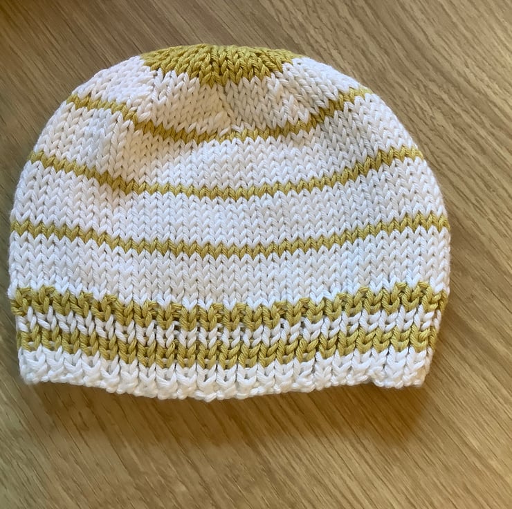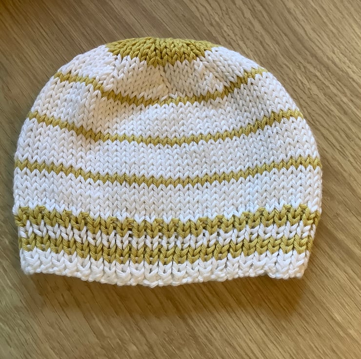 Hand Knitted Baby Hat in White and Gold. Suitable from birth. Made fromm100% Cotton Yarn. Feels lovely and soft. Measures 27cm circumference at the rib.