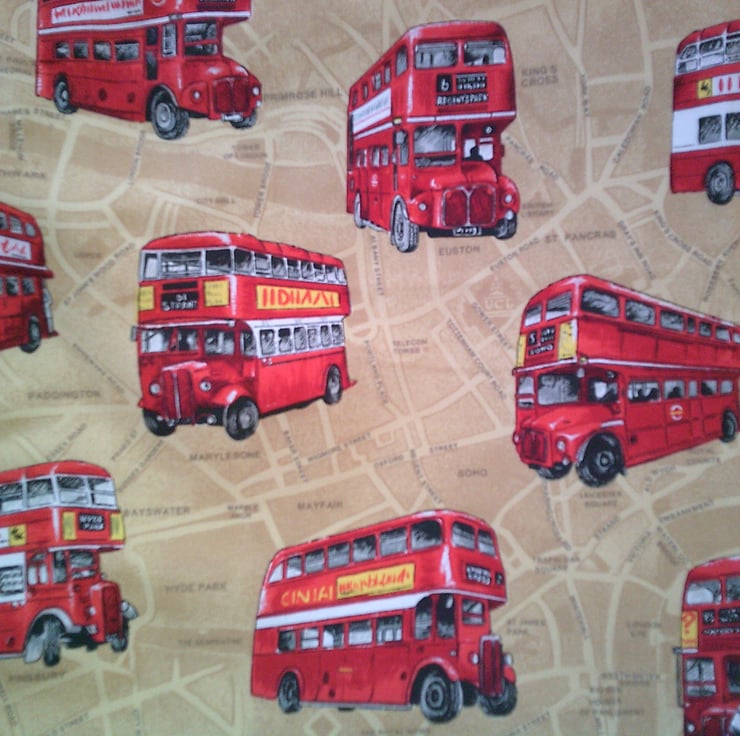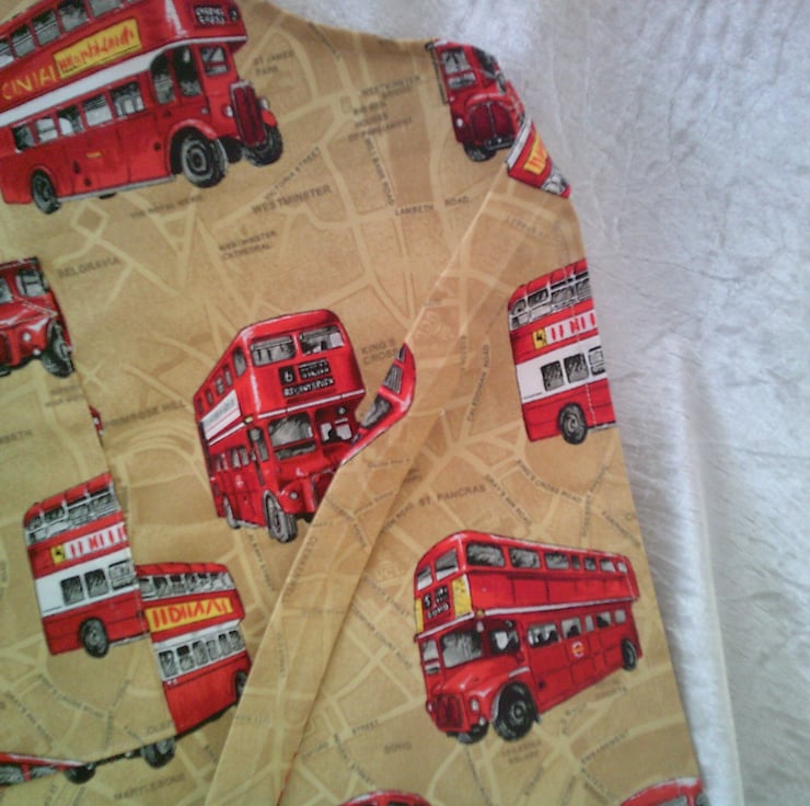 The design of the fabric used for this apron is of the iconic London Route Master Red Bus on a Beige background that looks like a street map.