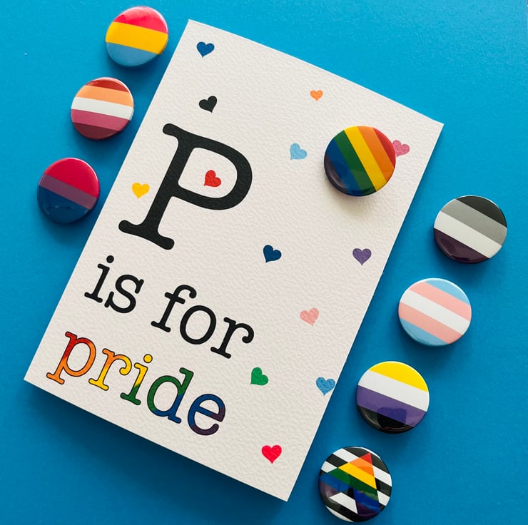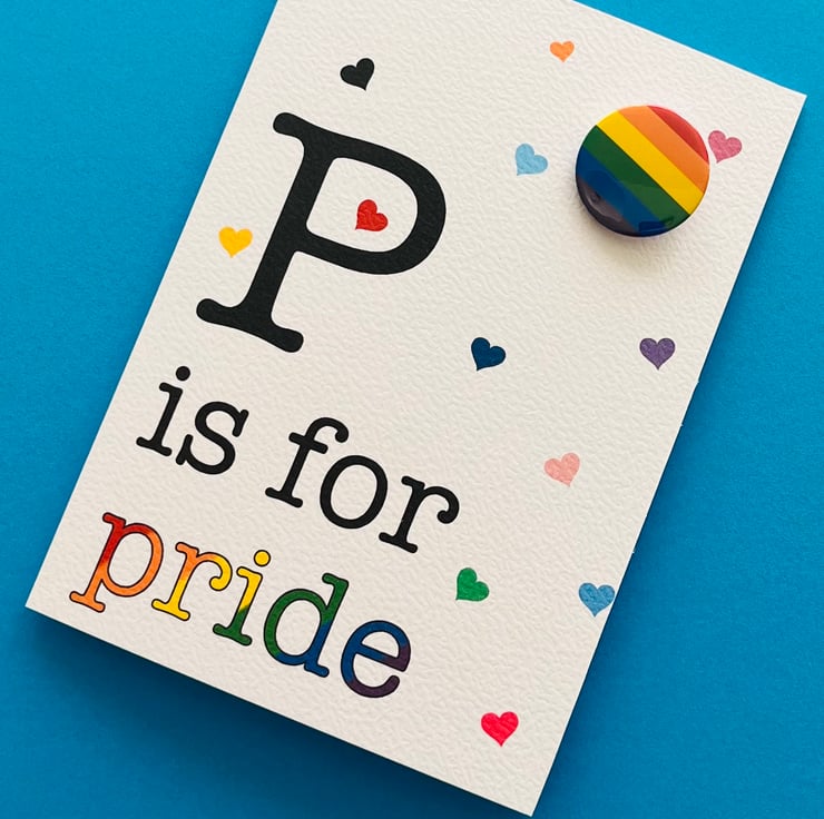 P is for pride card (choose your preferred flag) with removable LGBTQIA badge.