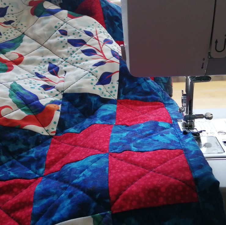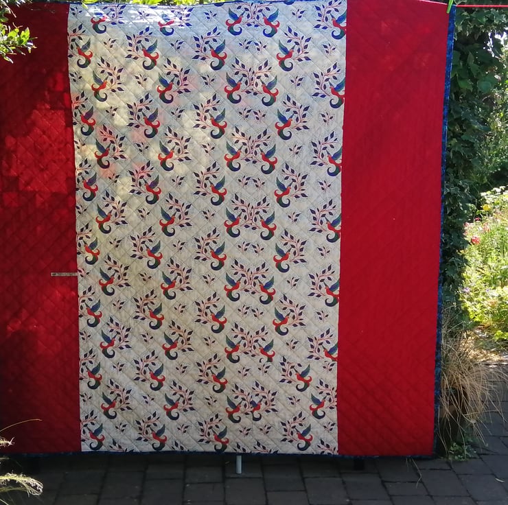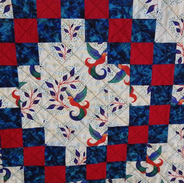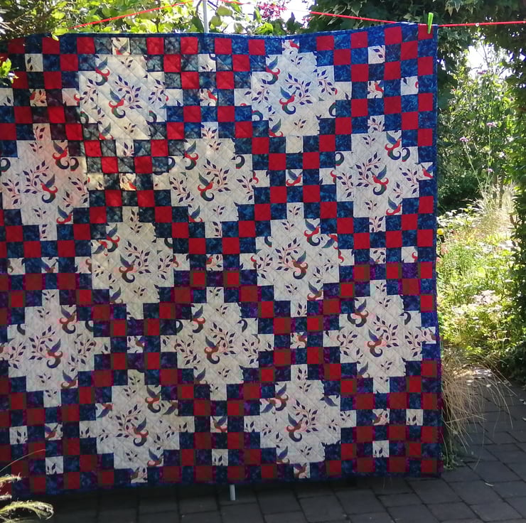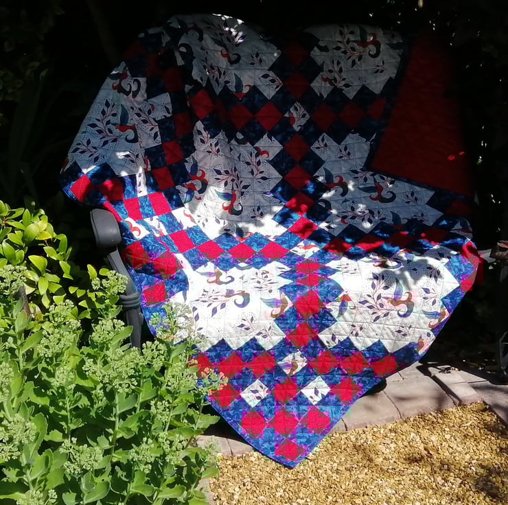 I have created this traditional Double Irish Chain Design Quilt in classic Red, White and Blue. It features a lovely Bird of Paradise fabric by Sarah Payne. I created this design to showcase the beautiful birds and to bring a touch of exotic colour and movement. For this quilt I chose to create a pieced backing...a little surprise when viewed from the back.
