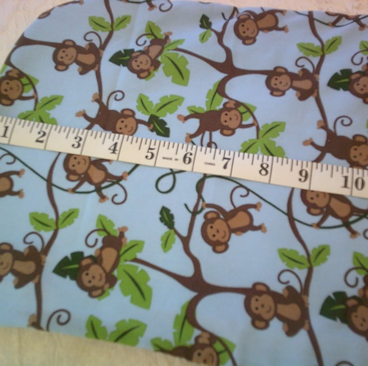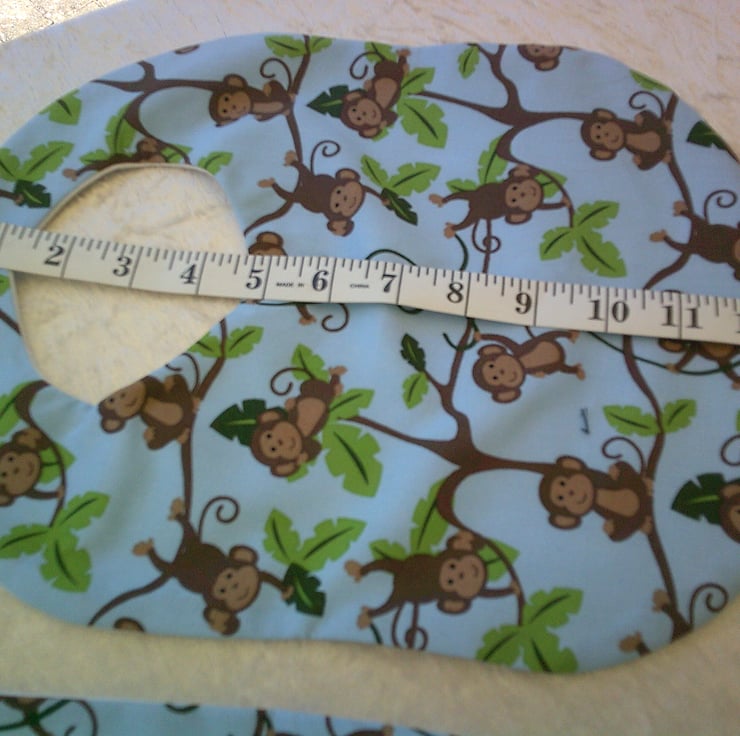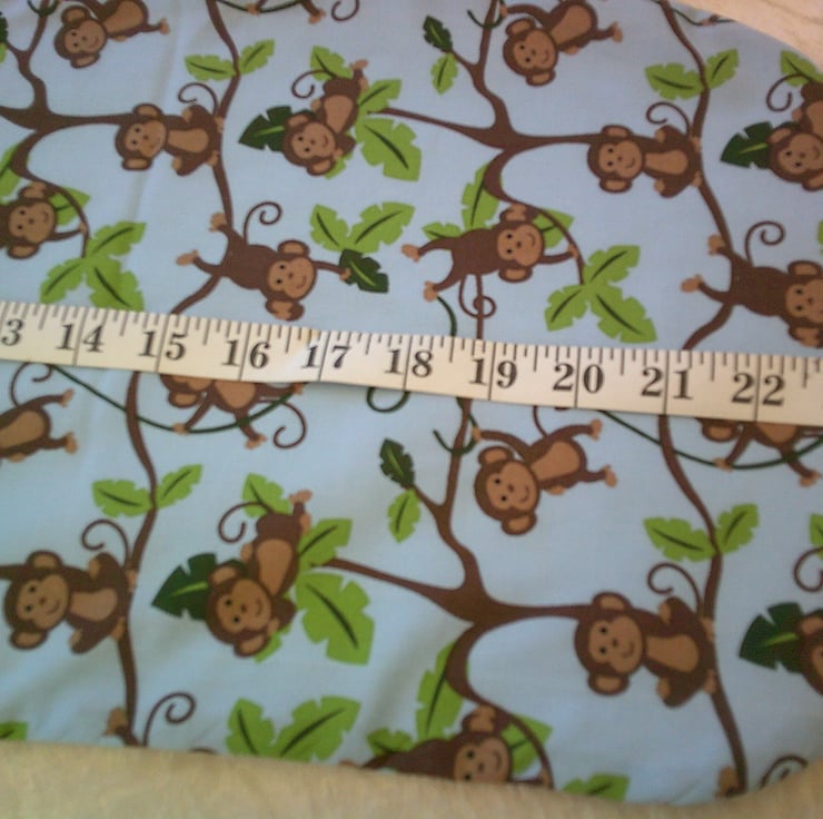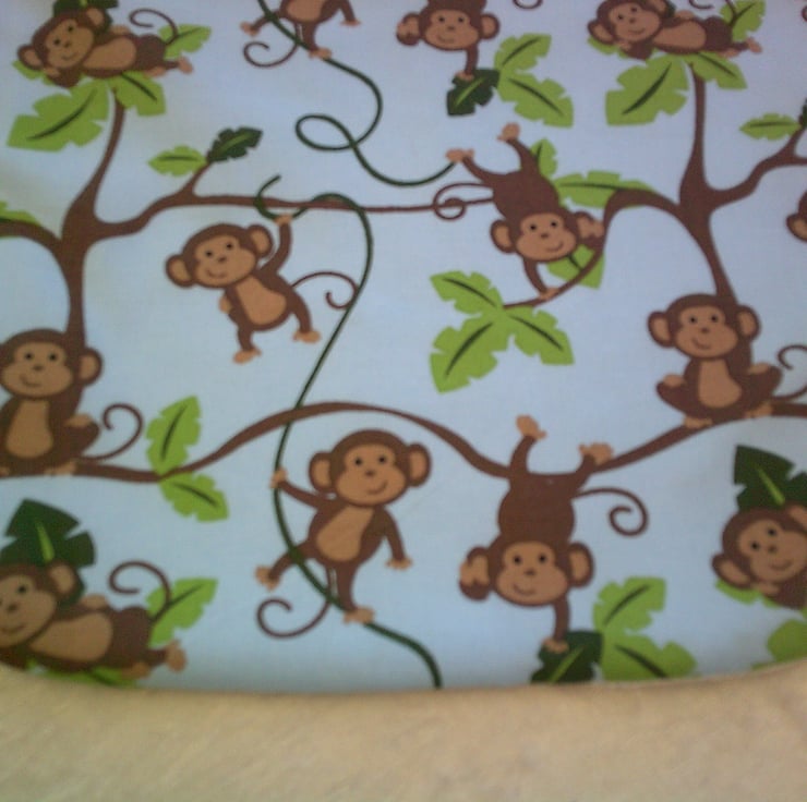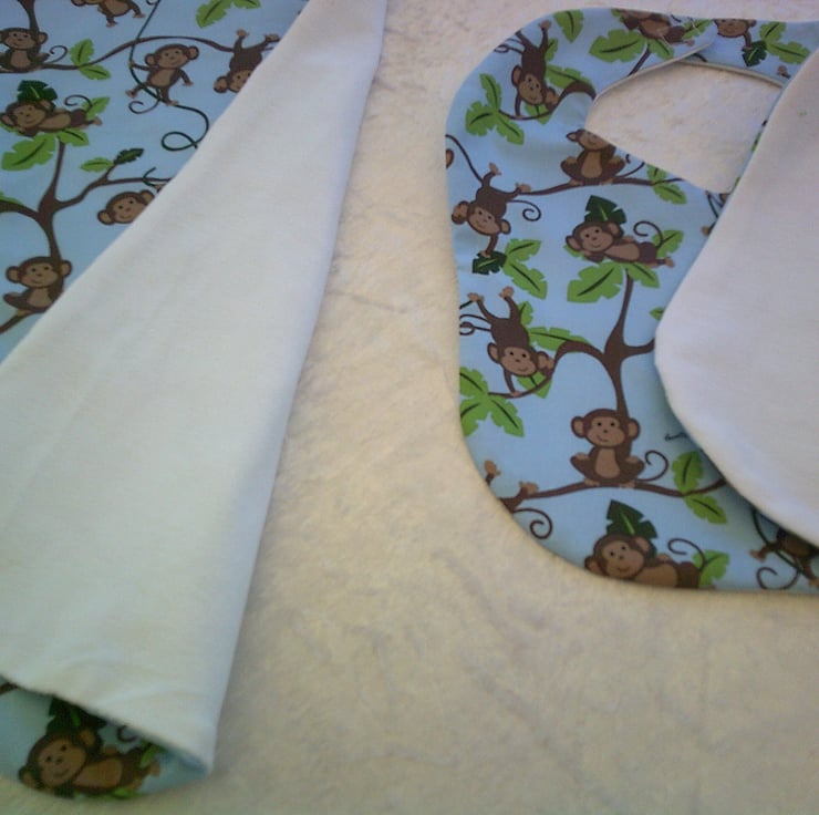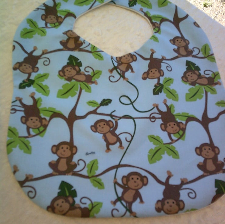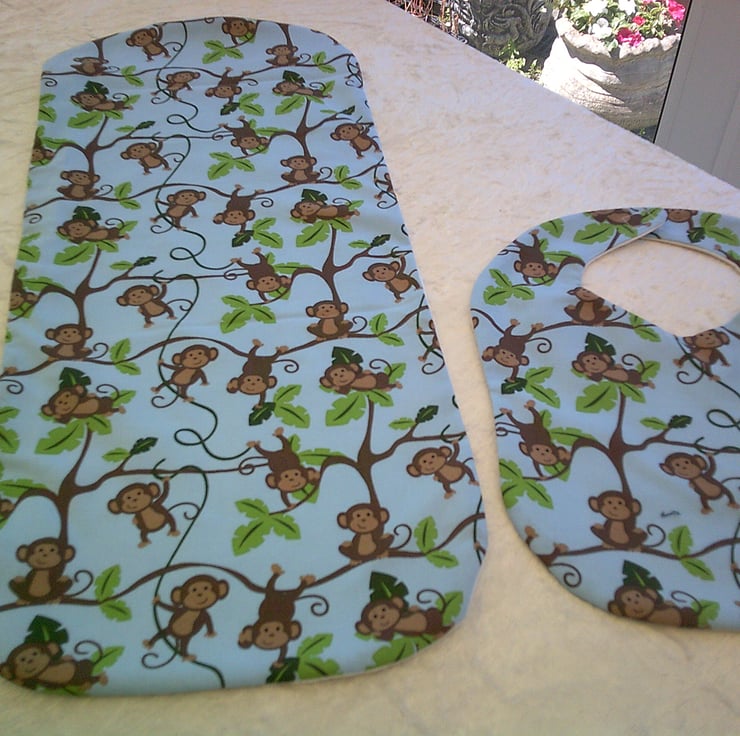 The fabric used is 100% cotton with a design of Monkeys swinging from trees on a blue background on one side and both the bib and burp cloth have reverse side of white stretch terry towelling The bib also has a Velcro fastening on the back of the neck to making it easy to put on and take off.