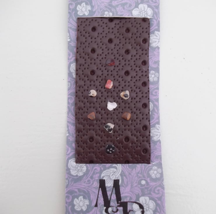 Handmade Leather Bookmark with healing crystal stone chips. Leopard skin jasper also known as jaguar stone, obsidian, white quartz and tigers eye Crystal stone chips in a shape just off-centre.
