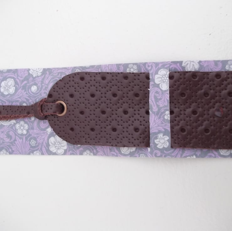 The leather has an embossed floral pattern texture.