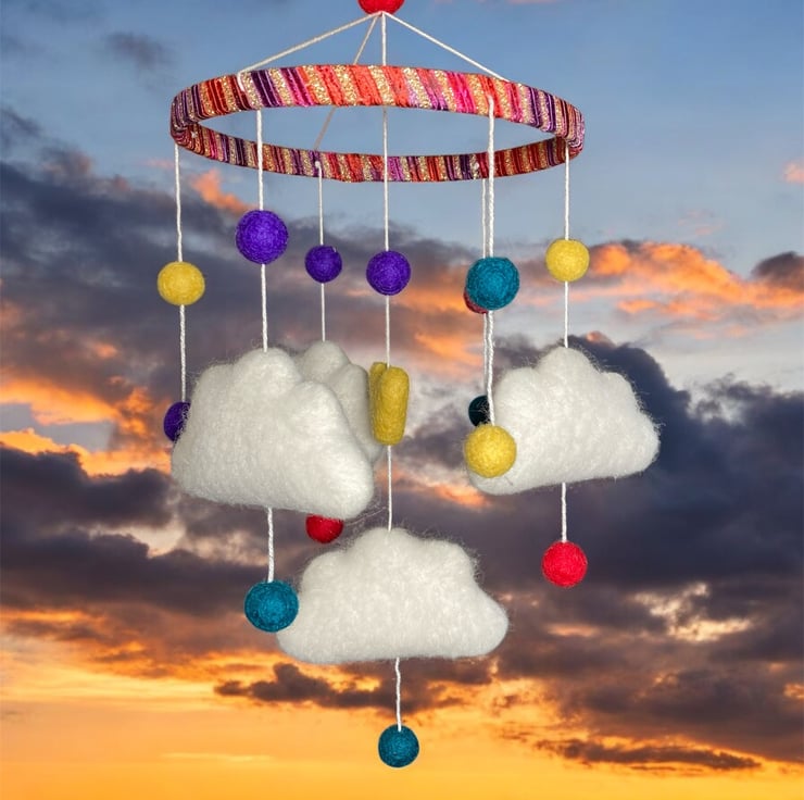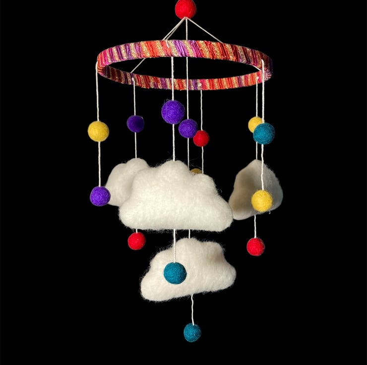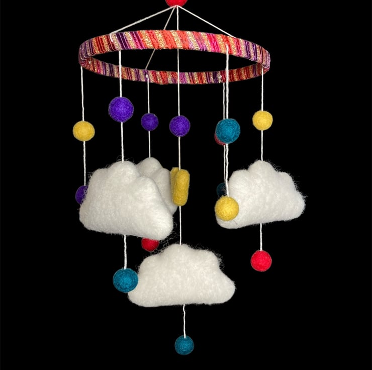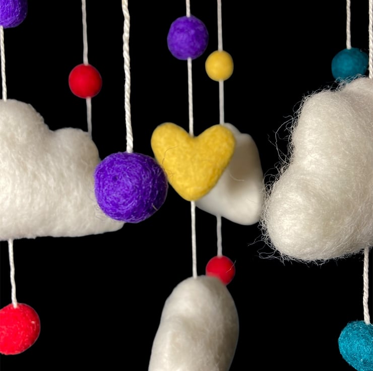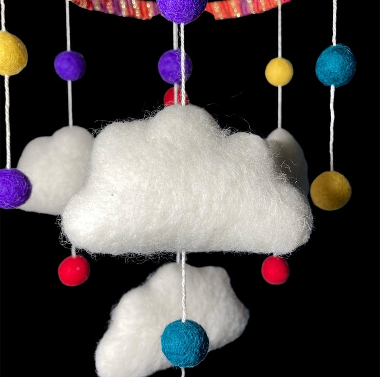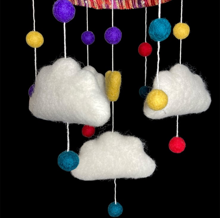 This mobile consists of four felted clouds, a variety of small felt balls and a felt heart, all suspended from a wooden hoop which has been covered in a sparkly red ribbon yarn. The mobile is ideal as a new baby or baby shower gift or to hang in a childs bedroom or playroom. The clouds are made from white woollen felt, lightly stuffed to create a 3d effect and covered in white woollen fibres which have been needle felted into place. Each cloud has been suspended from the hoop, along with bright multicoloured felt balls and felt heart, using cotton thread. A small brass hanging loop has been attached to the top to facilitate hanging.