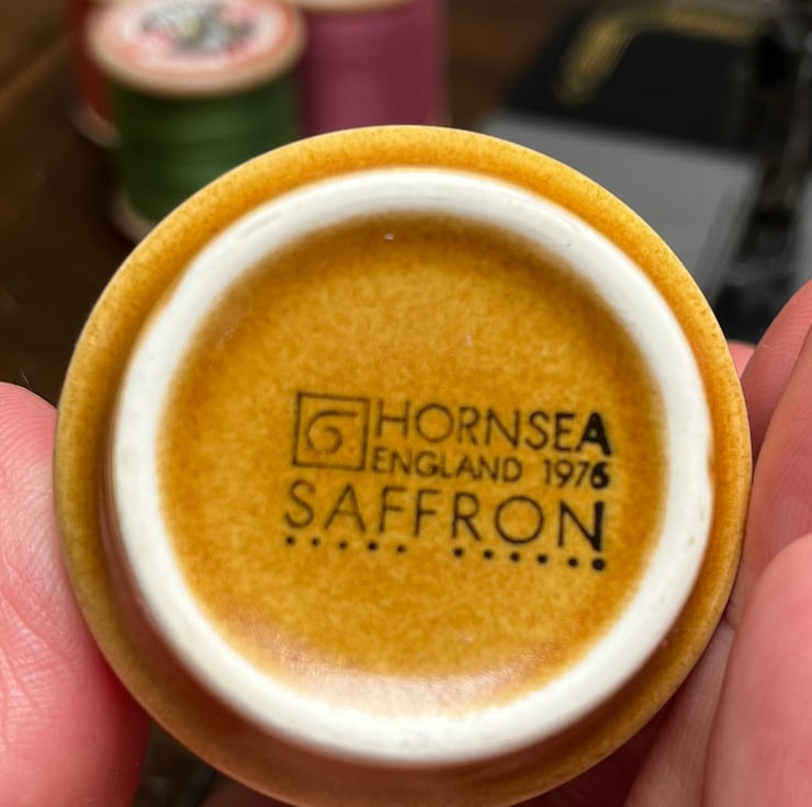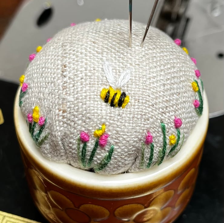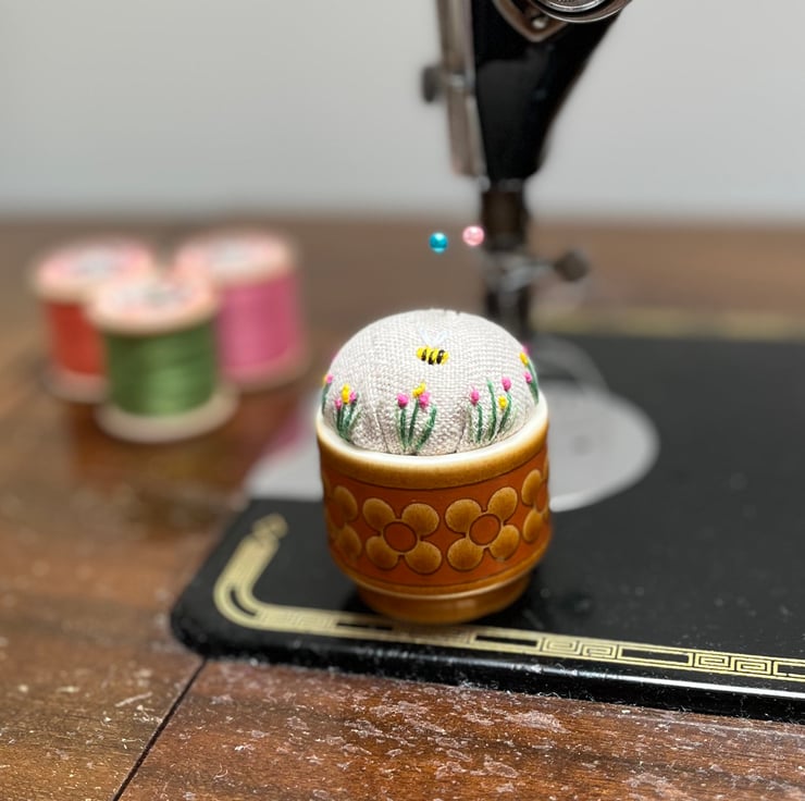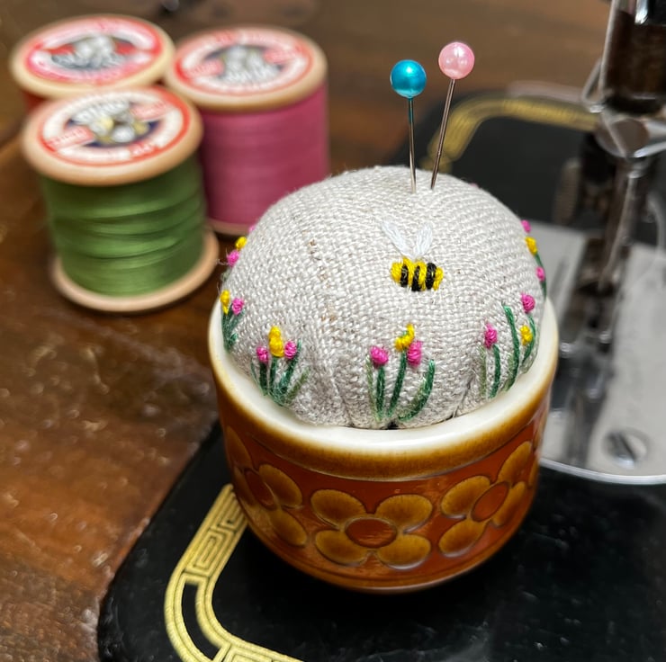 Pretty embroidered pincushion in a vintage 1970s Hornsea egg cup. The reclaimed linen cushion has been embroidered with tiny flowers and a bee.