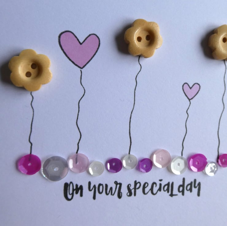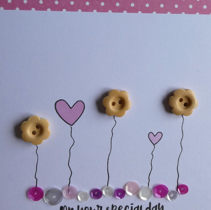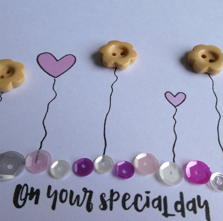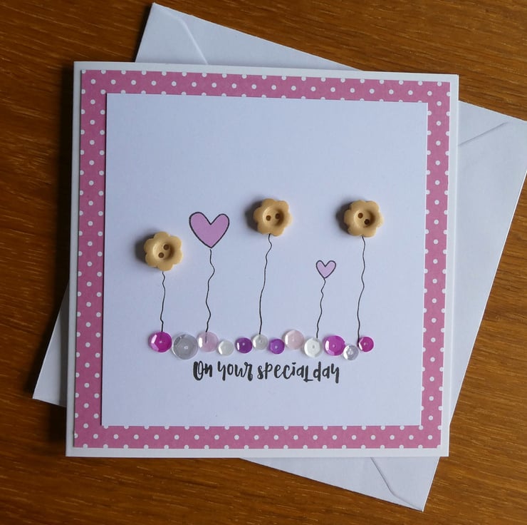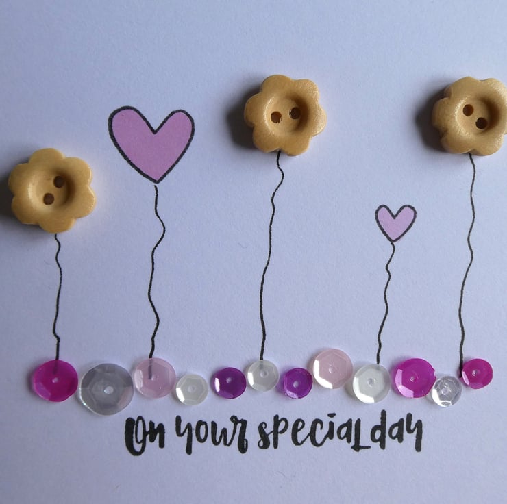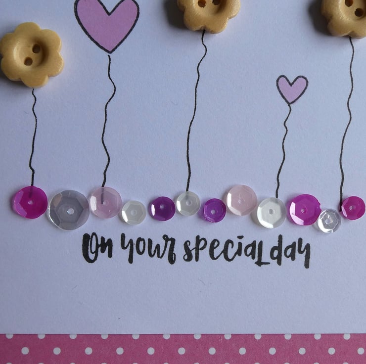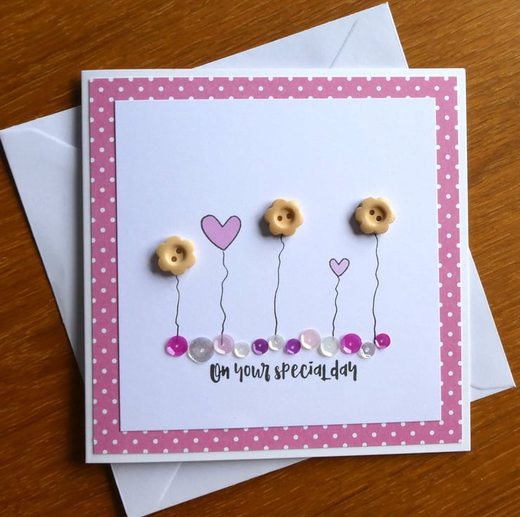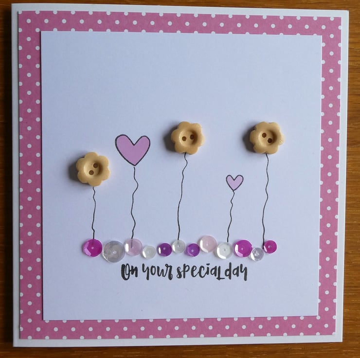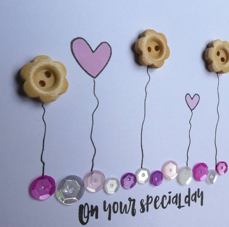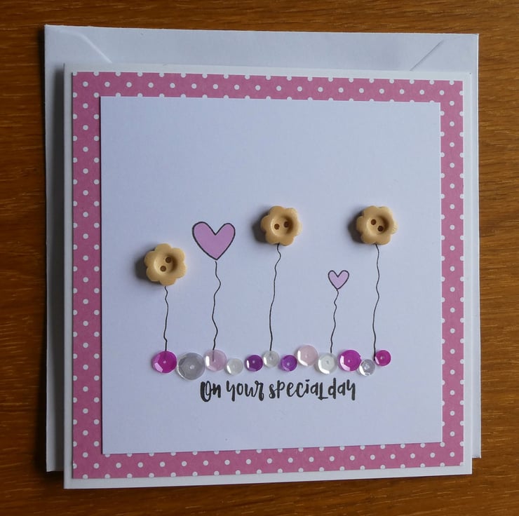 This pretty birthday card has a row of wooden button flowers and hand stamped hearts in soft pastel pinks, sitting above a line of sequins in shades of pink, silver and white and the message 'on your special day'.