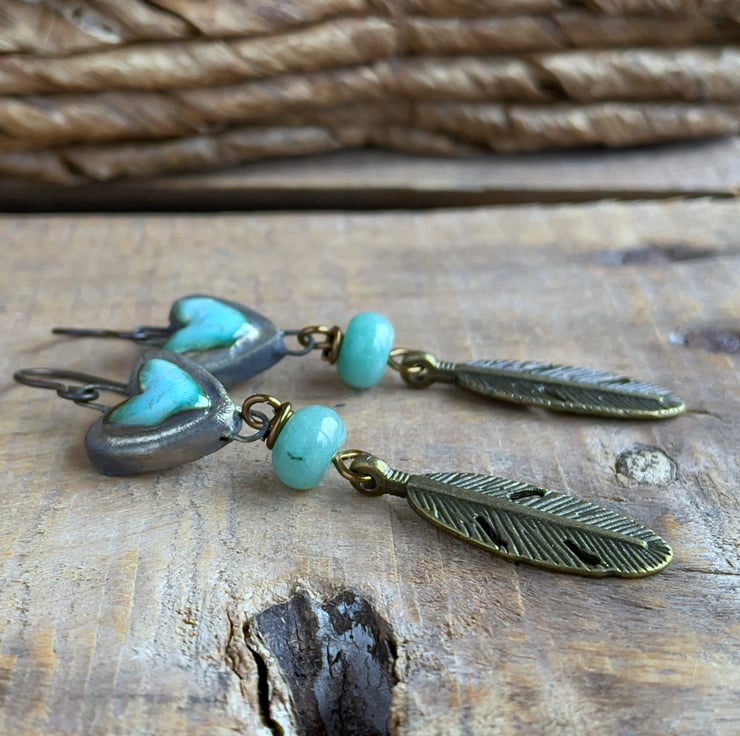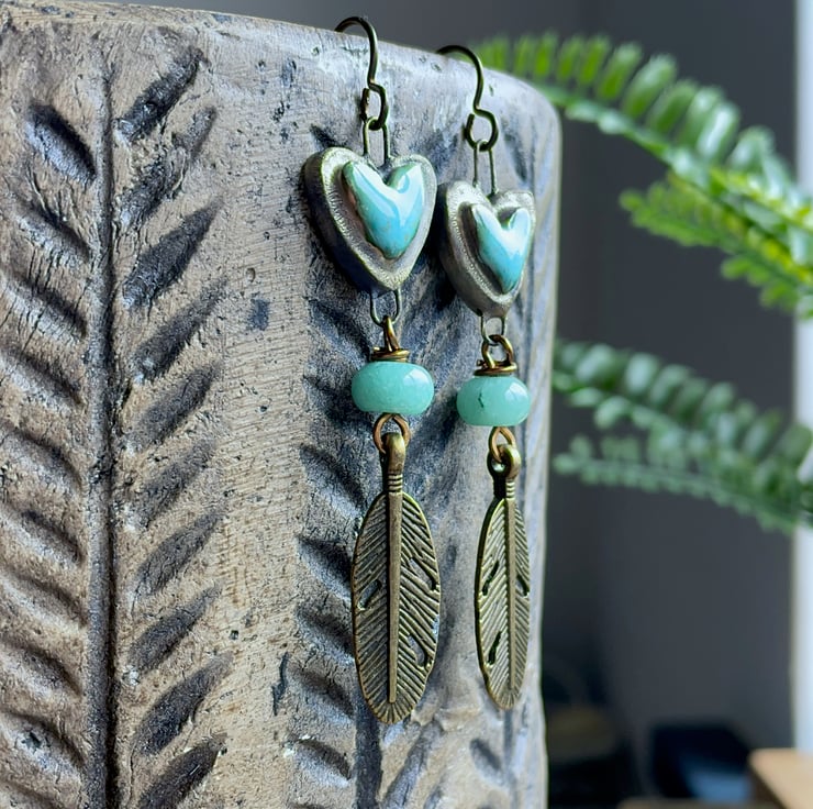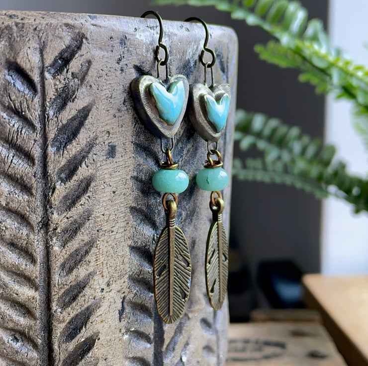 These handmade earrings feature ceramic heart connectors by UK bead artist Petra Carpreau, glazed in a vibrant turquoise with a rustic, earthy edge.