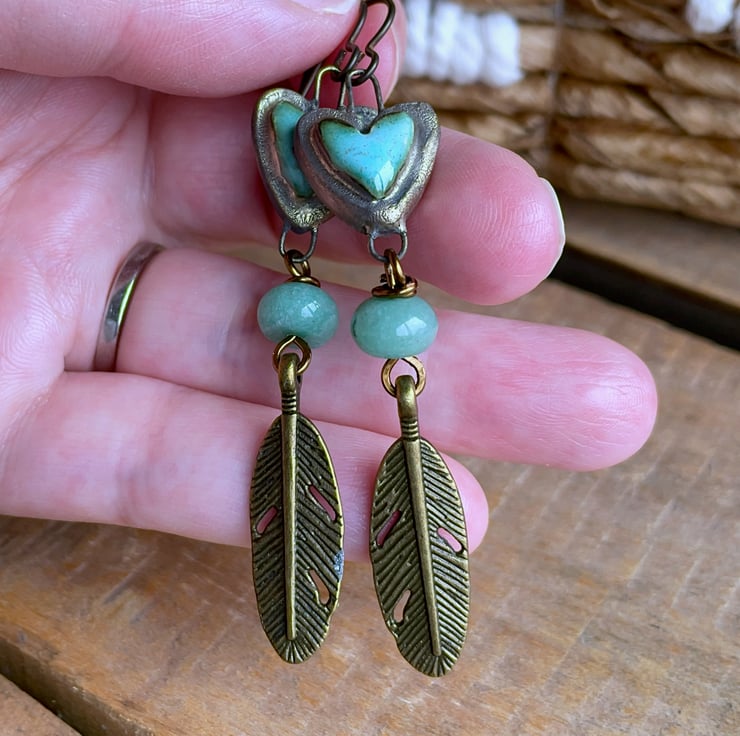 Beneath the hearts sit smooth green aventurine rondelles, paired with bronze-tone feather charms that add a nature-inspired feel.