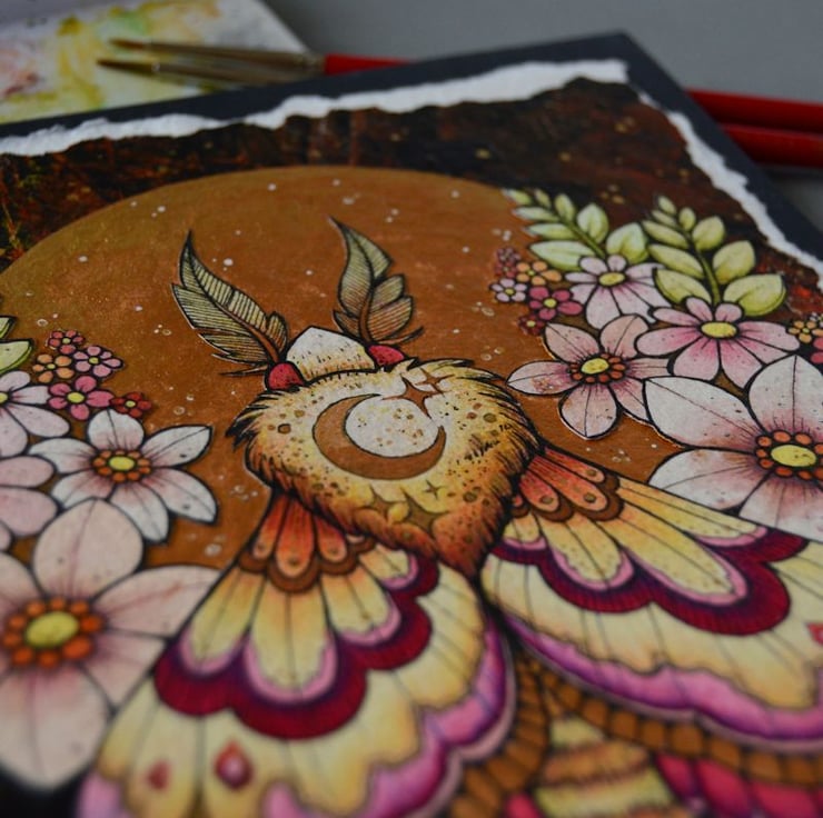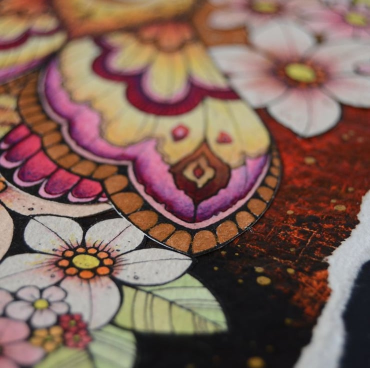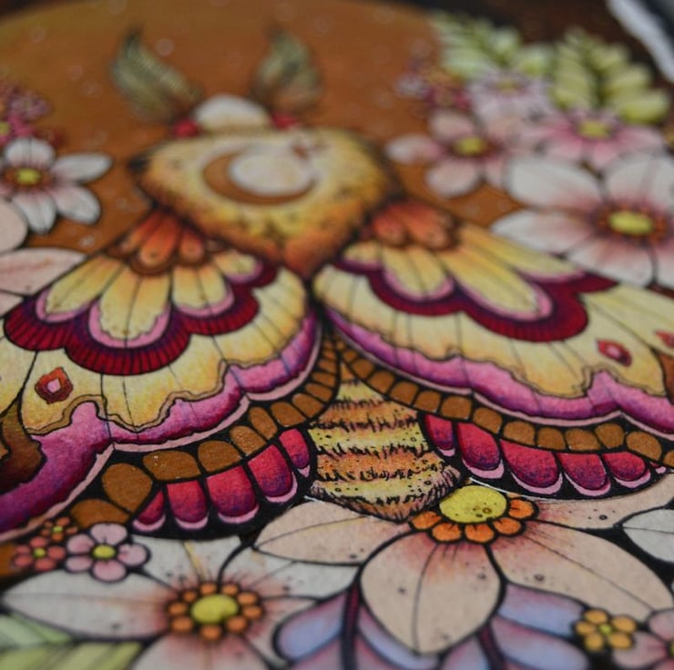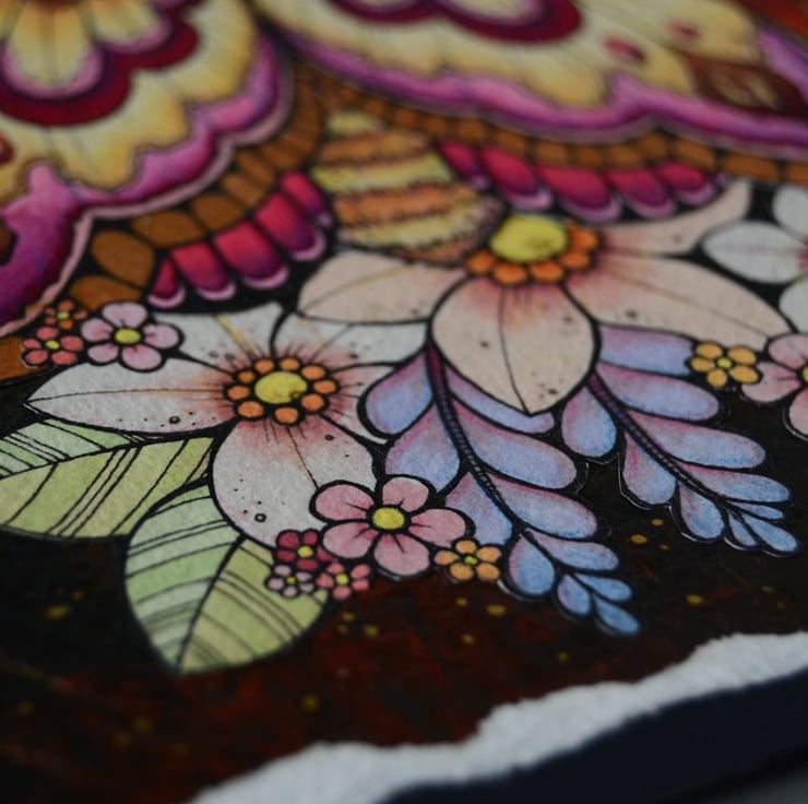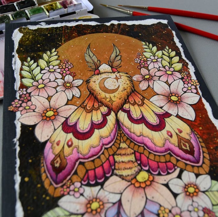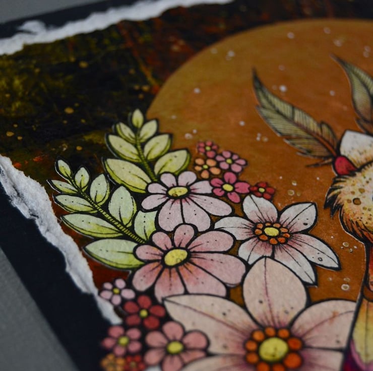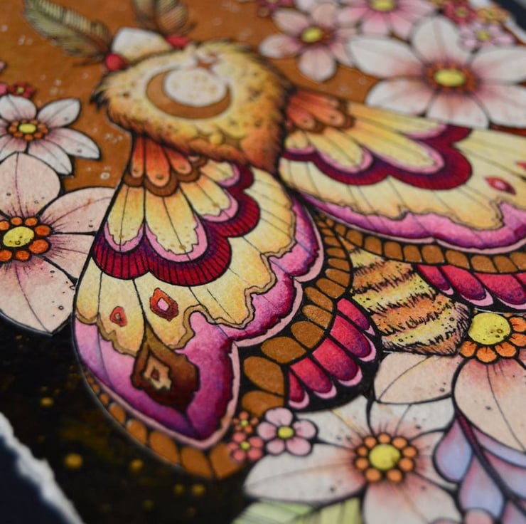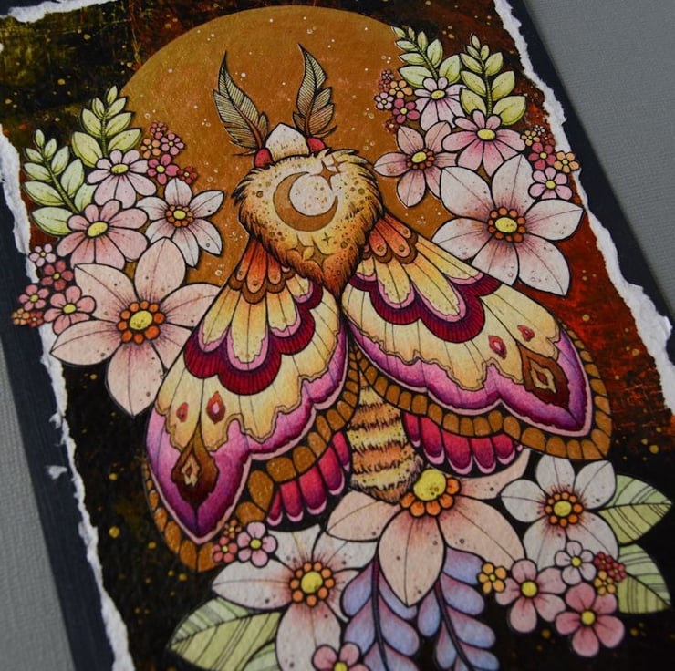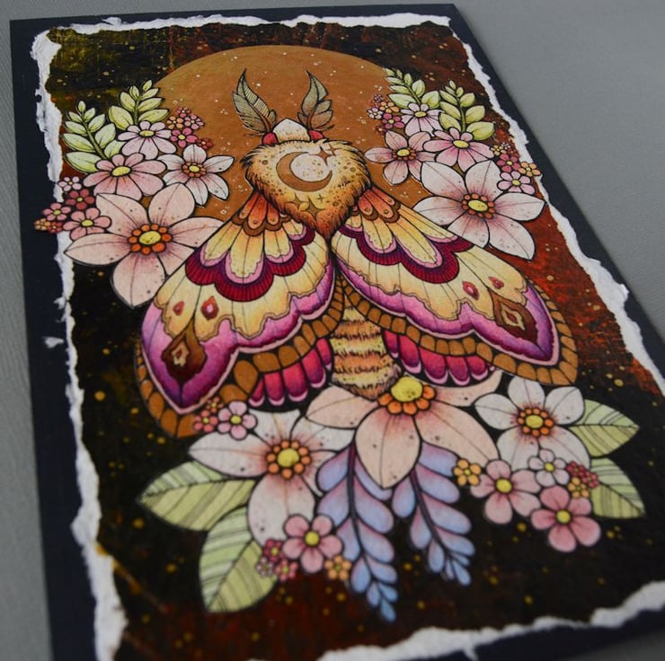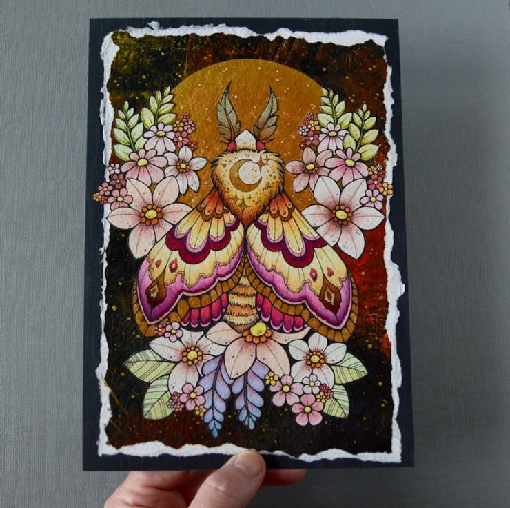 this artwork is an original collaged piece on khadi paper. the sun, moth and flowers are hand drawn on separate pieces of khadi paper, coloured with art pens, pencils, and watercolour paints, and each component is then cut out, and layered on to a background of painted tissue paper. the whole piece is then mounted onto an A5 sized piece of textured paper (300gsm), which i have painted with a paynes grey to give a dark surround/background.