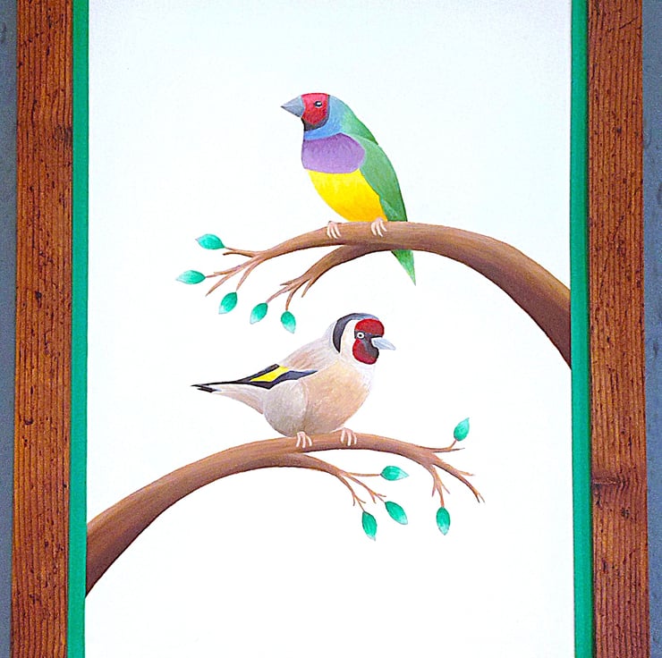 Framed high-quality coloured A3(42cm x 30cm) Giclee print of my painting of a Gouldian Finch and a Goldfinch perched on branches on a white background with a hard backing. The print comes finished with a stylish, modern dark green border. Framed with an expensive Styrene Protective Perspex (which has same clarity of glass) ready to hang. Buyer can choose from three types of frame; Black, Oak or Dark Oak. Colours of print with border may differ slightly due to computer/phone settings. All purchases delivered within 7-10 working days.