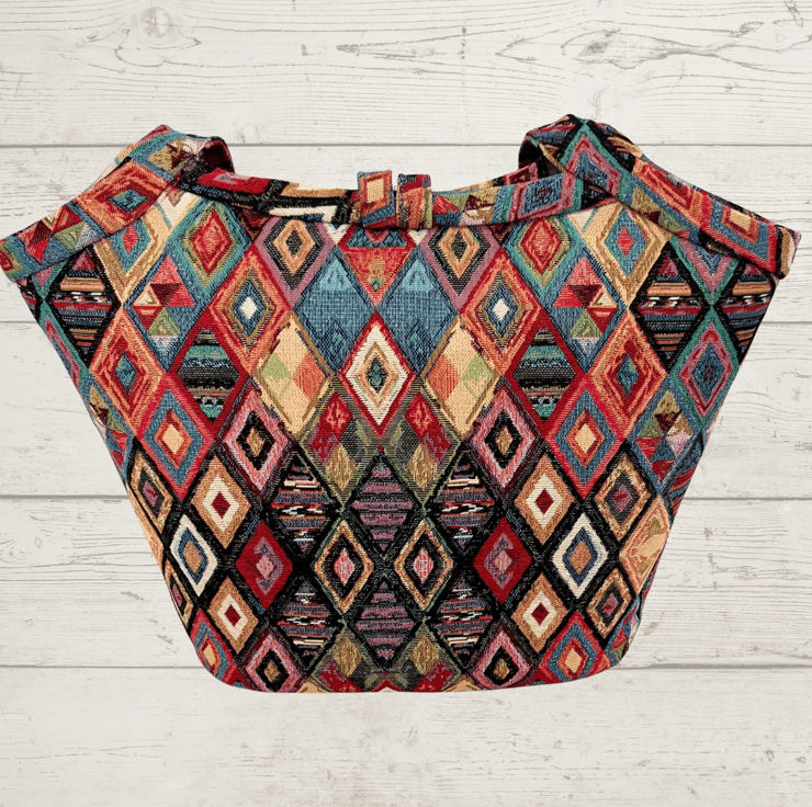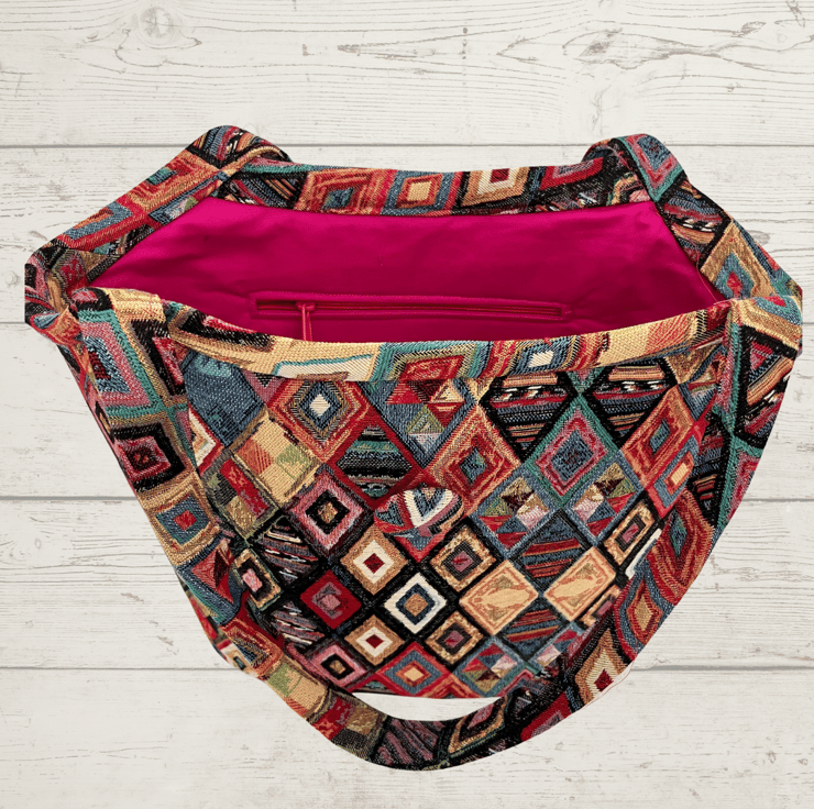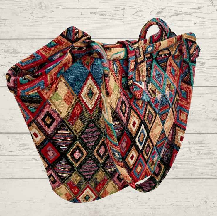 Add a splash of color and character to your everyday look with this stunning handmade bucket bag. Crafted from high-quality tapestry fabric, this bag features a vibrant geometric diamond pattern in rich hues of red, teal, gold, purple, and green. The roomy, unstructured design makes it perfect for daily use, weekend getaways, or market strolls.